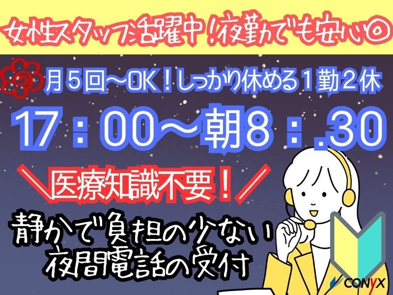【仕事内容】 \夜間帯ならではの集中できる環境/ 医療知識は不要!決められた手順で担当部署へ取り次ぐお仕事です。 【業務の流れ】 ・着信受付 ・部署へ電話転送 or 内線連絡 ⭕夜間の落ち着いたデスクワーク 深夜は2人体制で無理なくシフトインできます。 電話対応が中心で、余計な作業はほぼ発生しません♪ ⭕無理のない働き方 夜勤は「1勤務→2日休み」 曜日固定ではない変則シフトですが、その分しっかり休みが取れます◎ ===================== 充実したサポートが自慢です ===================== 創業70年以上のコニックスだからこそ、 働くスタッフへのフォロー体制は抜群です! ⭐未経験OK・安心サポート⭐ 業務につきましては、研修時に挨拶から細部に至るまで丁寧にお伝えします。 何か困った時には、担当スタッフがすぐにフォローにまわります。 ⭐働きやすさ⭐ 「家庭の都合や家族イベントなどでこの日はお休みしたい」などのお休み希望もOK! サポートのスタッフが替わりに入りますので、 プライベートとの両立もばっちりです。 【求人ID-JIM02A】