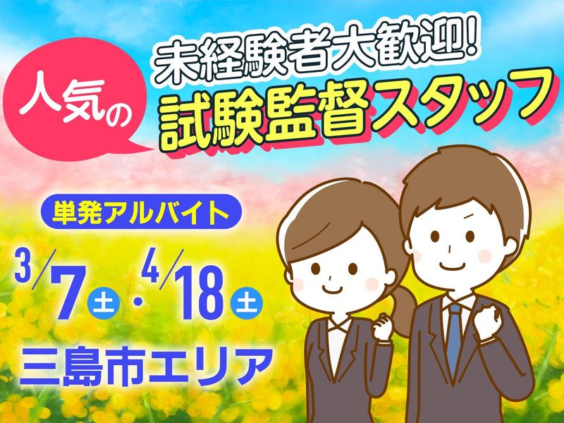 仕事内容 ―――――――――――――――――――― \学生限定/ *◆オンライン説明登録会◆* ―――――――――――――――――――― ◆開催日:随時受付中(予約時は2月2日(ダミー日程)を選択してください。) ◆会場:ご自宅 ※スマホ、PCがあればご自宅から参加OK! ※社会人のオンライン説明登録会の実施はございません。 ★応募後に説明登録会URLをお送りしますので ご予約&予約完了後に届くメールより 身上届登録システム入力後に資料を送付します。 資料が届きましたら視聴期間内に配信動画をご視聴ください♪ ★ご注意点★ 応募後に弊社より説明登録会URLをお送りします。 説明登録会の予約ページに進んでいただくと 日時が2026/2/2 00:00~と表示されますが、こちらはダミーです。 身上届登録システムご入力後、視聴期間内に配信動画をご視聴いただけます♪ ================= \レアバイト・人気バイトの【試験監督】/ 試験会場の運営スタッフのお仕事です。 受験者がスムーズに試験を受けられるようにサポートをお願いします。 ■受験生の誘導 ■受験生の出欠確認 ■試験開始・終了、注意事項のアナウンス ■問題用紙・答案用紙の配布&回収 etc. 【POINT】 ◎単発・短期!副業・Wワーク活躍中♪ ◎登録制!好きな時に働ける♪ ◎未経験歓迎♪シンプルなお仕事内容♪ マニュアルもありますのでご安心ください。 ★まずは説明・登録会にご参加ください♪ ★学生・社会人★ *◆対面 説明登録会◆* ―――――――――――――――――――― 3月7日(土) 10:00~(予約締切:3月5日(木)) 4月18日(土) 10:00~(予約締切:4月16日(木)) ※会場:三島市民文化会館(三島市一番町20-5) アクセス:JR「三島駅」南口より徒歩3分 ※所要時間:1時間半 **下記の会場でも同時募集中!** ★学生・社会人★ *◆対面 説明登録会◆* ――――――――――――――――― 3月8日(日) 10:00〜(予約締切:3月5日(木)) 4月19日(日) 10:00〜(予約締切:4月16日(木)) ※会場:河合塾 浜松校(浜松市中区田町326-19) アクセス:JR「浜松駅」北口から徒歩7分 ※所要時間:1時間半 3月14日(土) 10:00~(予約締切:3月12日(木)) 4月12日(日) 10:00~(予約締切:4月9日(木)) ※会場:静岡労政会館(静岡市葵区黒金町5-1) アクセス:JR「静岡駅」北口より徒歩7分 ※所要時間:1時間半 =================