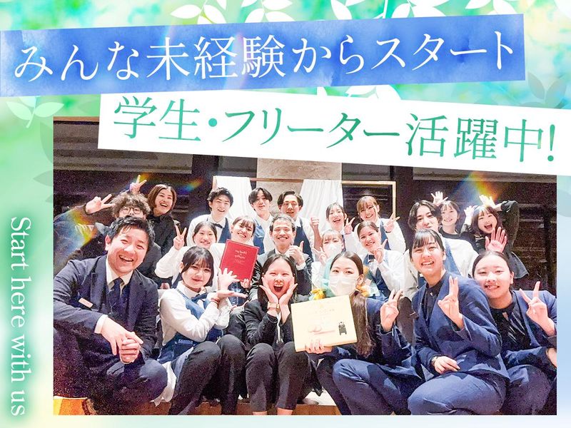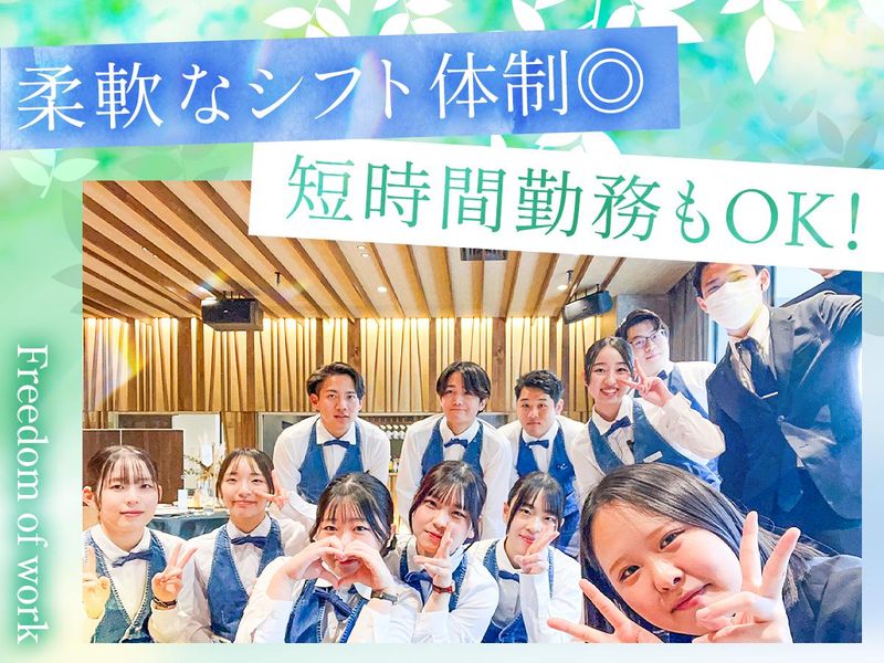 仕事内容 ▲ iiiii ▲ |-⌒-⌒-⌒-⌒-⌒-⌒-⌒-⌒-⌒-⌒| 楽しいことが好き!大歓迎♪ |-⌒-⌒-⌒-⌒-⌒-⌒-⌒-⌒-⌒-⌒| \ 学生さんが幅広く活躍中 / ――――――――――――――― 「大学進学前に友達が欲しい!」 「ブライダルやホテルに興味がある」 「とにかく楽しいバイトがしたい!」など みんな初バイトをスタートしています♪ なので『初バイト』大歓迎!! ――――――◆◇◆―――――― バイトデビュー応援中 ――――――◆◇◆―――――― ★バイト友達ができちゃいます☆彡 ――――――――――――――― 同世代の仲間や先輩が多くて、 「ここ分からないな…」の質問から どんどん友達が出来ちゃうかも!? ★学校と両立しながら働きたい!☆彡 ――――――――――――――― シフトは<学校優先>で大丈夫◎ 急遽予定が入り、シフトをキャンセル したい時は『前日まで』に申請すれば調整! 学校に慣れるまで少しずつでもOKです! ★高時給!しっかり稼げる!☆彡 ――――――――――――――― 直近で時給UPし1200円に↗↗ サクッと稼げる環境です! ☆…☆…☆…☆…☆…☆ \他にも・・・こんなPOINTも/ - ◆気軽に相談しやすいシフト体制 ◆土日メインの勤務×週1日~OK ◆フルタイム歓迎◎安定した収入をGET ◆日払い・週払い・前払いOK(規定有) ――――――――◆◇◆―――――――― “幸せ”を届ける新メンバーを大募集! ――――――――◆◇◆―――――――― 【お仕事内容】 ・挙式の進行 ・フロントや披露宴会場などでのレセプション業務 ・会場設営、片付け ・新郎新婦様のアテンド ・プランナーのサポート …など 最初は主に お客様に料理やドリンクを提供するWaiter その後は両親係や、進行のサポート、 フードのコントロール、ドリンクメイクなど 適正に合わせて覚えていきましょう。 ☆…☆…☆…☆…☆…☆ ◎色んな大学の先輩が活躍中! 熊本大学をはじめ東海大学、 熊本学園大学、尚絅大学、 九州ルーテル学院大学など いろんな専門学校・大学へ通学♪