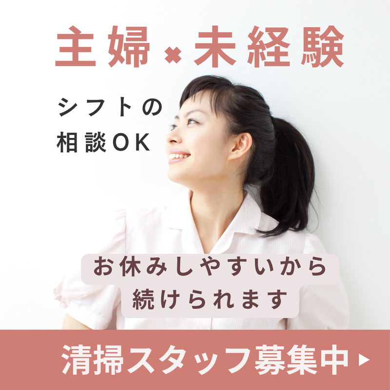 求めている人材 \未経験の方、大歓迎!学歴・ブランク不問/ 【必須条件】 ■長期でご勤務いただける方 ■20歳以上の方(喫煙可能区域での業務を含むため) 【一つでも当てはまればピッタリです!】 ・コツコツと作業するのが好きな方 ・人に喜ばれる仕事をしたい方 ・体を動かして運動不足を解消したい方 ・扶養内で働きたい主婦・主夫の方 ・久しぶりのお仕事復帰を目指す方 ・土日はしっかり休みを取りたい方 ※女子トイレがあるので女性が活躍しています ※30代40代50代60代・・年齢にかかわらず活躍中