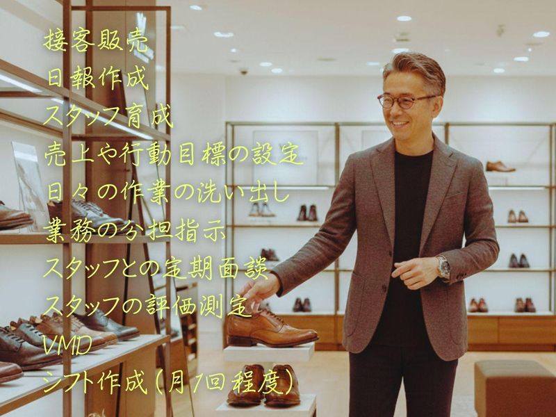 仕事内容 ■年間休日120日以上 ■キャリアの安定感と将来性あり ■知的な販売スタイルでスキルアップ ■自分自身のマーケット価値を高める ■経営視点のマネジメント力GET りんくうアウトレットにて COLE HAANの店長候補を募集します 【募集概要】 雇用形態:正社員 勤務:シフト制 休日:月10日程度 給与:固定給25万円~※詳細後述 【業務内容】 接客販売 日報作成 スタッフ育成 売上や行動目標の設定 日々の作業の洗い出し 業務の分担指示 スタッフとの定期面談 スタッフの評価測定 VMD シフト作成(月1回程度) 店長会出席 【研修について】 ■動画で座学研修 ■ブランド統括による対面研修 ■マニュアルあり ■定期フォローあり 【ブランドについて】 クラシックな革靴の見た目と スニーカーの履き心地を融合させた 「ゼログランド」などの革新プロダクトで 30代から絶大な支持を得ています 【“足元から”の神髄】 自社製品を社販で愛用できることは 働く側にとっても大きなメリットです 常に洗練されたシューズを履き 身だしなみを磨くことには大きな価値あり