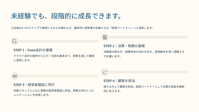 求める人材: 【必須条件】 ・ 日商簿記2級(取得後5年以内であれば尚良し) ・ 普通自動車免許(AT限定可) ・ PCの基本操作ができる方 【こんな方は特に歓迎!】 ・ 業界経験者でもfreeeに興味のある方 ・ 素直に質問できる方、わからないことをそのままにしない方 ・ 地道な確認作業を丁寧に続けられる方 ・ 生成AIに興味があり、新しいツールややり方もまずは試してみようと思える方 ・ Googleツールやチャットツールなどの利用に抵抗がない方 ・ 人の話をよく聞き、相手に合わせて伝えようとできる方 ・ 接客・営業・窓口対応など、人と接する仕事の経験がある方 ・ 経営者と深く関わり、数字以上の価値を届けたい方 ・ 税理士資格の取得を目指している方(科目合格一時金制度あり) ・ 「手間を惜しむための手間を惜しまない」という考え方に共感できる方 ※未経験の方も歓迎します 【なぜ簿記2級が必要なのか】 freee会計で会計データ処理はかなり自動化できるようになり、入力に簿記の知識は重要ではなくなりました。数字をまとめたり理解するのにあたり社内共通言語として2級の知識が欲しいのが理由です。 【なぜ未経験で大丈夫なのか】 freee会計での処理は、従来の複式簿記会計ソフトとは考え方が大きく異なります。そのため、従来の会計ソフト経験がある方より、むしろ未経験の方の方がスムーズに理解できることもあります。