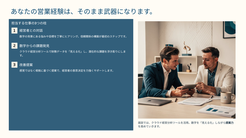アピールポイント: ▶ freee会計5★アドバイザー|クラウド会計に強い事務所 広島ではまだ少ない freee会計5つ星アドバイザーです。 freee会計・マネーフォワードなどクラウドツールを前提とした会計・税務の進め方を実務で学べます。クラウド会計に強い事務所で、新しい時代の会計人としての経験を積めます。 ▶ 生成AIを実務で使いこなす職場 ChatGPT・Claude・Gemini・Gammaなど有償AIツールを導入。「税務サポートロボ」「メール添削ロボ」なども整備しています。 AIを使って作業を減らし、人は判断・対話など付加価値の高い仕事に集中する。そんな働き方を実践しています。 ▶ 経営者と直接向き合う仕事 当社ではクライアントとの経営面談を重視しています。 freee会計やクラウド経営分析ツール(metrics)を活用しながら、数字をもとに経営者と対話します。 入社後は代表や先輩社員と同行しながら早期から経営者と対話する機会があります。経営者と話せる会計人へ成長していきます。 ▶ 営業経験が、税理士事務所で最大の武器になります 数字を整えるだけの会計人は、AIによって代替されていきます。 これから必要とされるのは経営者の悩みをヒアリングし、タイミングよく提案できる会計人です。 前職の営業・接客経験は、税理士事務所でそのまま強みになります。 ▶ 25年の税務実績 × 税務署長OB税理士の知見 2002年創業、25年の税務実績があります。 また元大規模税務署長の税理士2名を顧問税理士として迎えており、法人税・相続税・譲渡所得など高度な税務相談に触れながら学べます。 税務の専門性を近くで学べる環境です。 ▶ まだ進化の途中の事務所です 私たちは「完成された事務所」ではありません。 AI・クラウド・働き方も、今まさに進化している途中です。 だからこそ、新しく入る人の強みやアイデアが、そのまま事務所の成長につながります。 完璧な人材よりも、一緒に成長していける人を歓迎しています。 【職場環境・働き方の実態】 ▶「わからない」と言える文化があります 悩んだまま時間をかけるより、早く相談する方が全員にとって良い結果になります。「わからないことはわからないと言ってほしい」と明確に伝えています。 そのためにAIロボも整備しています。 クライアントとの面談でも、即答しなくて構いません。 ▶失敗は責めるより、仕組みで解決します 失敗しないのは、新しいことに挑戦していないのと同じです。 小さな失敗から大きく学ぶことを大切にしています。 失敗も成功も、ナレッジとして共有しながらチーム全体が強くなる仕組みを作っています。 ▶期限までに仕上げる仕事。だからこそ助け合えます 急な体調不良や予定があっても、周りがカバーします。 ただし、期限のある仕事ですので、正社員にはリカバリーの責任も伴います。 お互いを信頼し、助け合いながら仕事を完結させる文化です。 【スタッフの声】 40代正社員 「税理士事務所というと堅いイメージでしたが、わからないことを素直に聞ける雰囲気があって助かっています。」 30代正社員 「最初は会計ソフトの見方もよく分かりませんでしたが、レビューで『なぜこの処理になるのか』まで教えてもらえたので、丸暗記ではなく理解しながら進められました。」 パートさん 「クラウド会計freeeやAIツールを活用することで、手作業だけに頼らず効率よく仕事を進められるようになりました。」
