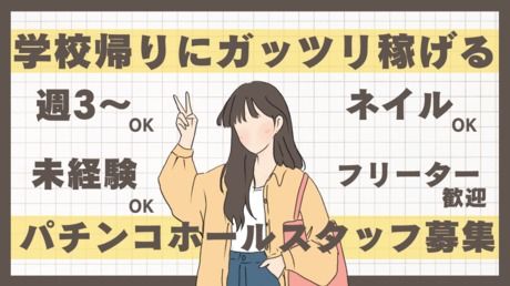 資格 人と接することが好きな方 お客様とのちょっとした会話や笑顔のあいさつができる方ならOK! 接客が初めての方でも、「人に喜んでもらいたい」という気持ちがあれば大歓迎です。 チームで協力して働ける方 スタッフ同士の連携が大切な仕事です。 「困ったときはお互いさま」の精神で、協力し合える方をお待ちしています! 前向きに取り組める方 分からないことは少しずつ覚えていけば大丈夫! 「できることから頑張ってみよう」という前向きな姿勢を応援します。 責任感を持って仕事に向き合える方 お客様に安心して遊んでいただくために、細かな気配りも大切なお仕事です。 任された業務をコツコツと取り組める方にぴったりです。 新しいことにチャレンジしたい方 「パチンコ業界に興味がある」「接客スキルを身につけたい」など、 未経験から新しい仕事に挑戦したい方にぴったりの職場です!