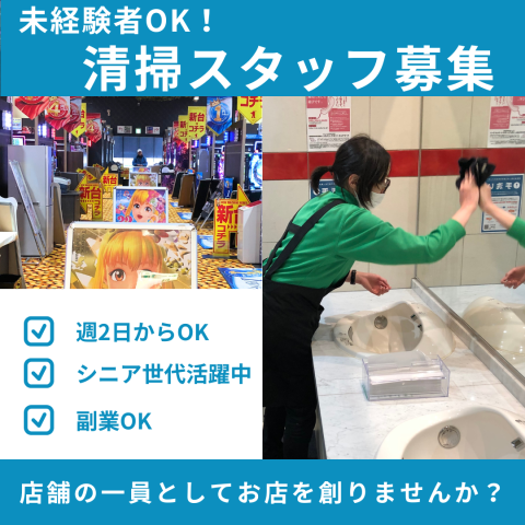 募集要項 職種 パチンコ店内の清掃スタッフ 雇用形態 アルバイト / パート 仕事内容 店舗内の簡単な清掃です。 主な作業は、 *トイレ清掃 *ゴミ回収 *各出入口の清掃 *各シンク周りの清掃 *お客様休憩スペースの清掃 *灰皿清掃 などです。 どの清掃も特別な道具の使用はないのでご安心ください。 最初は先輩スタッフからマンツーマンで作業方法を教えてもらいます。 作業方法を把握できれば、あとは1人で作業をしていただきます。 黙々と1人で作業することが好きな人には特におすすめのお仕事です!