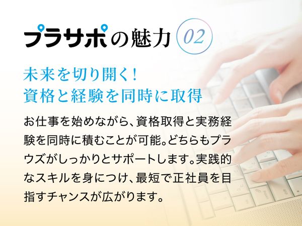 仕事内容 ケアハウスでの介護補助業務 ・入居者への声かけや見守り ・相談援助などのコミュニケーションを含む自立支援 ・レクリエーションや各行事などの企画、実施 ・環境保全(施設内備品など管理、衛生管理) <求人のポイント> 雄大な日本海や白山連峰を一望できる眺望に恵まれたロケーションの中にあるケアハウスでのお仕事です。 入居者の方は比較的自立した方が多く、見守りや声かけなどの介護補助中心です。 いしかわ魅力ある福祉職場にも認定されている素敵な事業所です♪ 資格や経験がない方にもおすすめな求人ですよ。 介護職デビューの方も大歓迎です。 チームワークを大切にできる方、笑顔でコミュニケーションが取れる方大募集! 人気の紹介予定派遣の求人です。 約3~6ヶ月ほど派遣で就業していただき、その後は正社員登用の予定です。 正社員を一緒に目指しましょう! 現場見学も随時受け付けております。 お問い合わせお待ちしております。 <プラウズからのひとこと> *資格も経験も「プラサポ」で! ご希望者には私たちプラウズが提供する資格取得サポート「プラサポ」で、 お仕事をしながら、資格取得のための通信講座を「無料※」で受けられます! 無資格・未経験からでも医療事務や調剤事務、医師事務作業補助者など、 医療の現場で活躍するためのスキルと経験を同時に手に入れることができます。 興味のある方はぜひお気軽にお問合せください。(※当社規定あり) <直接雇用後の雇用条件(正社員)> ■勤務時間/ ①8:30~17:30(休憩60分) ②9:00~18:00(休憩60分) 宿直 17:30~翌8:30(月2回程度お願いします) ①②をシフト制で勤務していただきます ■休日・休暇/週休2日制 ■給与/月給189,000~255,000円 (基本給174,000~240,000円+業務手当15,000円) ■待遇/ ・宿直手当:1回5,000円(月2回程度) ・資格手当:社会福祉士 10,000円 介護福祉士 6,500円 ・扶養手当あり ・交通費規定支給 ・昇給あり:1月あたり650円~2,600円(前年度実績) ・賞与あり:年2回 計3.50ヶ月分(前年度実績)