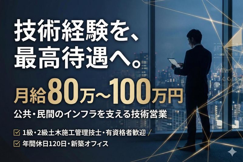 仕事内容 < 営業経験3年以上の方へ > 「売る営業」から、 “技術で選ばれる営業”へ。 高収入/年休120日以上/退職金あり。 経験と成果に、 本気で還元する環境です。 ✅月給80万円以上スタート! ✅成果はインセンティブで還元 ✅官公庁・大型案件中心の安定基盤 ✅提案~工事管理まで一貫して関われる ✅経験者・ベテランも活躍中! ✅新築オフィス×年休120日で快適勤務 【 お仕事の詳細 】 道路・橋梁・トンネルなどの 公共インフラや、大手メーカー工場の メンテナンス分野において、 技術理解や資格を強みにした 提案営業を行います。 土木施工管理技士などをお持ちの方は、 工事内容の技術説明や積算・管理面で より裁量を持って活躍できます。 ▼具体的には… ・官公庁、ゼネコン、法人顧客へ技術提案 ・現地調査、積算、見積書作成 ・工事内容の技術的説明、契約対応 ・工程/品質/安全面の確認 ・協力会社との調整、進捗管理 ※営業職としての採用ですが、 受注後は工事全体の管理にも関わります ※「提案して終わり」ではなく、 技術と営業の両面で 案件を動かすポジションです 【 求人のポイント 】 ⭐成果を正当に還元する評価制度 ――――――――――――――――――― 工事利益の10%を インセンティブとして支給! 上限はなく、 大型案件ほど収入に直結する仕組みです。 ⭐営業経験+資格・技術で差がつく ――――――――――――――――――― 営業経験に加え、 施工管理資格や技術知識がある方は 提案の幅・案件規模ともに広がります。 ⭐官公庁・大型案件中心の安定基盤 ――――――――――――――――――― 官公庁や大手企業案件を中心に、 実績を積める営業ポジションです。 完全週休2日制に加え、賞与年2回 退職金制度ありと待遇面も整っており、 長期的なキャリアを築きやすい環境です。 \こんな職場です/ ……………………… 営業部は20代〜40代が活躍しており、 穏やかな雰囲気の中で協力しながら 業務に取り組んでいます。 新築オフィスならではの快適な環境のもと、 日々の仕事に集中できます。 公共・民間の両軸で事業を展開しているため 安定した環境で長く働ける点も特徴です。