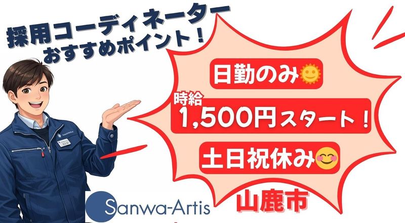 選考プロセス ―――ご登録について――― 1.オンラインでの登録 スマホやタブレット、PCがあれば、 いつでもその場で登録が可能です! ※履歴書不要 2.サンワアルティス事務所での登録 住所▶熊本県菊池市泗水町吉富205-4 ※履歴書不要 1または2のいずれかを選択可能です。 どちらも事前に予約が 必要となりますので、 ご希望の際は当社担当者まで ご連絡ください。 入社日はご相談ください♪ <担当者> サンワアルティス株式会社 採用担当者 TEL▶0120-880-889 携帯▶080-8560-7040