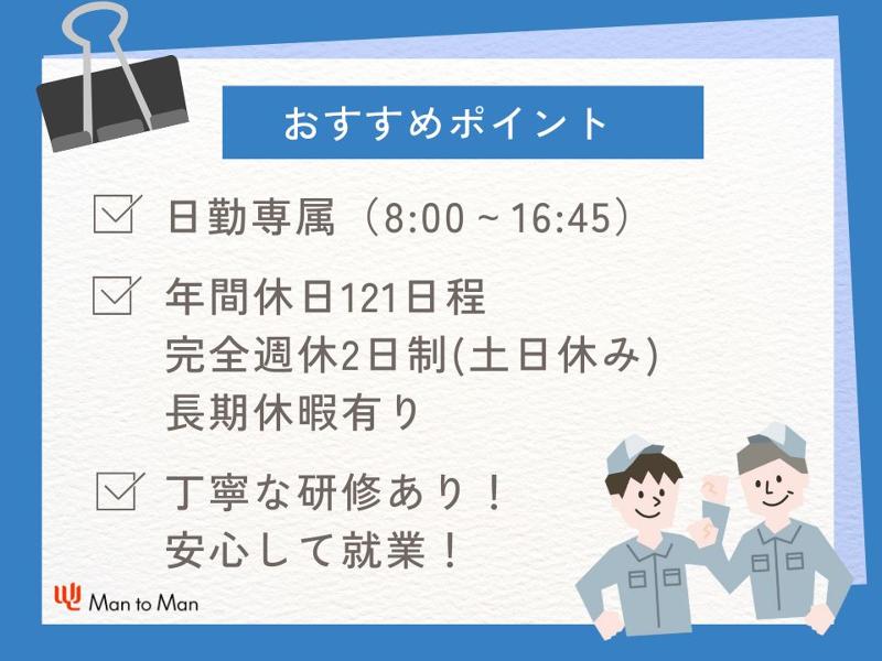 求める人材: 【応募資格】 未経験OK/ブランクOK 特別な知識・スキルは一切不要です。 未経験からスタートした方が半数以上 ーーーーーーーーーーーーーーーーーー Man to Manでは他にも以下の様な スタッフさんが活躍されています。 ・異職種から転職された方 ・工場ワークに興味のある方 ・昼勤で働きたい方 ・男性活躍中の職場で働きたい方 ・20代、30代(若年層)活躍中の職場で 働きたい方 ・寮に住み込みで働きたい方 ・とにかく稼ぎたい方 ・プライベートを充実させたい方 ・年間休日120日以上の職場で働きたい方 ・経験を活かしたい方 ーーーーーーーーーーーーーーーーーー Man to Manには、 ハローワークや一般求人誌には掲載されて いないお仕事情報もたくさんありますので、 まずはお気軽にお問合せください。