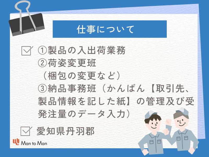 アピールポイント: 【大人気の日勤で工場ワーク】製品の入出荷スタッフ