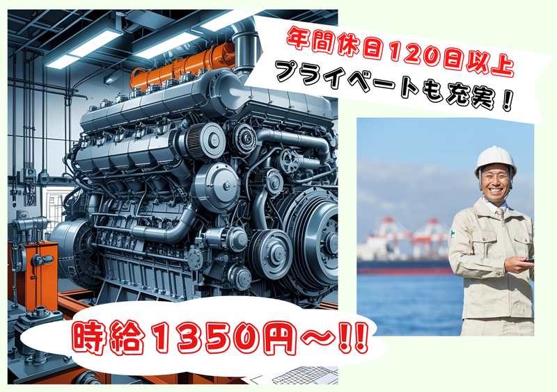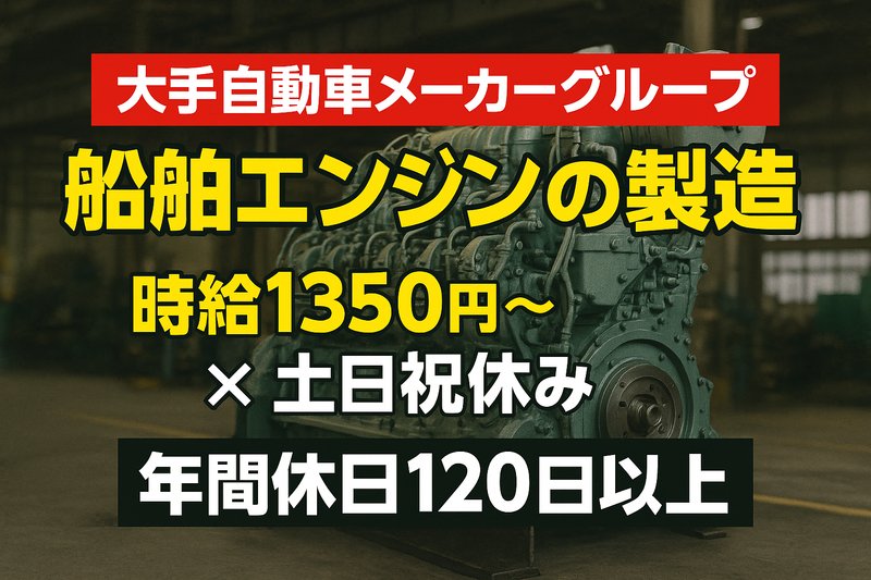 職場環境 船のエンジンを製造しており、日本の大手自動車メーカーのグループ企業です。 工場内は綺麗で、ロッカーやシャワールーム、食堂等もあり大変福利厚生もしっかりしている企業様です。 安心してお仕事できる環境です。 喫煙所:喫煙所あり(屋外)
