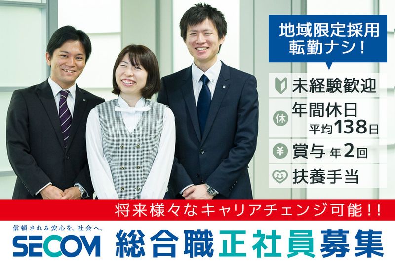 【仕事内容】 総合職として様々な分野で将来ご活躍頂くため、まずはセコムの根幹であるセキュリティ業務からスタートしていただきます。 【具体的には】 セキュリティスタッフとしてセコムグループのさまざまなサービスの最前線で高度な「安全・安心」を提供するセキュリティのプロとして、スキルを磨いていただきます。 <セキュリティ業務の内容> [1]緊急対処 センサーの異常信号やお客様からの要請に基づき現地に急行。 状況に合った適切な対処を行ない、正常化を図ります。 対処内容はセンサー感知、火災、救急、点検要請と様々です。 [2]ATM障害対応 ご契約金融機関のATMに障害が発生した場合に正常化します。 例えばお札やカード、通帳が機械に詰まってしまったとき等です。 [3]保守点検・セキュリティ強化の提案 各種セキュリティ機器を定期的にチェック、異常がある場合は修理・交換を行ないます。 またお客様のニーズに合わせてセキュリティ強化のご提案をし、常にハイレベルなセキュリティを維持・提供します。 【入社後の教育制度】 セコムの研修所であるセコムHDセンター(多摩・御殿場・名張・阿蘇)にて 入社時研修を行ないます。期間は7日~8日を予定。 センターまでの交通費や宿泊費はすべて会社が負担いたします。 研修内容としては、「社会に有益な事業を行なう」という セコムの基本理念や社員としての心構え、グループ商品などです。 また基本動作や救急法といった知識や技能についてお教えします。 ★将来は適性・能力に応じて様々なキャリアが目指せます★ セキュリティスタッフから先も以下のようなポジションで多種多様な仕事にチャレンジしていくことが可能です。将来は総合職としてセコムの精神をグループ全体へと広めていけるようご活躍ください! ・営業(個人・法人) ・技術(施工管理・設備管理) ・管理部門(人事・経理・総務など)など また、セキュリティ事業以外にも幅広く事業を展開しているため自分に合ったキャリアを歩むことができます。 東証一部上場 様々なキャリアを描けるセコムの総合職 仙台宮城にUJIターン歓迎!『地域限定社員』 福利厚生充実/平均休日138日/扶養手当あり 「安心して暮らしたい」そんな当たり前の願いを叶えるため、日本にセキュリティ文化をもたらしたセコム。1962年の創業以来、順調に売上も推移し、特に基幹事業であるセキュリティに関しては、現在317万件を超えるまでに成長しています。 今後もより多くのお客様へ安心と安全を提供していくために【地域限定正社員】の募集をスタートさせました。「愛着のある宮城県内で長く働き続けたい」という方、ぜひご応募ください! 今回は、セコムグループのあらゆる事業領域での活躍が期待される総合職正社員の募集です。 将来的に適性・スキルにより、多岐にわたる職種(営業、技術、事務、企画等)・事業所責任者など幹部登用やセコムグループ内の他業種への道も開かれています。入社後、まずは機械警備サービススタッフとして警備業務(交替制勤務)に従事し、各職域で必須となるセキュリティのスキル・知識の習得を目指してください。将来は様々な分野へキャリアチェンジ!幹部登用やセコムグループ内の他業種への道も開かれています。どうしたら世の中の役に立てるか、誰かの役に立ちたいと強く願うあなたからのご応募をお待ちしています! ◆転勤のない地域限定社員!UJIターン希望者歓迎! 地域限定コースは基本、県外への転勤はありません。(異動範囲は基本として配属先の同一県内のみです)「扶養手当」「育児手当」などライフスタイルの変化に応じて将来の計画が立てやすいのも魅力。財形貯蓄や退職金制度などの将来をサポートする制度もあり安心。より活躍の場を広げたい方には全国転勤がある制度へ変更可能など、あなたのキャリアに合わせた選択が可能です。 ◆未経験/第二新卒/ブランク復帰/異業種からのチャレンジ大歓迎! ◆東証一部上場 安定した基盤のもと様々なキャリアを築ける その他