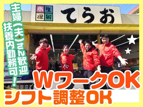 仕事内容 18時閉店のスーパー! お客様と従業員の笑顔の為日々奮闘中! ★未経験大歓迎★ 未経験スタート9割!! スーパーのスの字も知らなくて大丈夫! ■仕事内容詳細… 野菜、果物の ・加工、計量 ・値付け、袋詰め ・品出し、陳列 などお願いします! バックヤードでの作業ではなく、 店頭での作業になるためお客様と 会話する機会などが多いです! みなさんが思い描いている スーパーマーケットではありません! ★18時閉店! ★水曜日定休日 ★1/1から4連休 ★ゴ ールデ ンウィーク3連休 ★8月のお盆も3連休! ⇒メリハリをつけた働き方が可能! お休みを重視する方にお勧め? ▼休みだけじゃありません! 頑張りが給与に反映するお仕事 ★20代の若手スタッフ活躍中★ 高校卒業しててらおに入社した方、 大学卒業して新卒で入った方、 社会人を3年ほど経験して 中途入社した方など様々! 20代のスタッフが多く働いており、 いい意味で!(笑)部活の延長 みたいな雰囲気です! スタッフ同士仲が良く、 社歴年齢関係なく、 皆で協力し合っています! SNSでも発信中! ★HP★ https://terao-s.co.jp/ ★インスタグラム★ 八千代店⇒@terao_yachiyoten 西船橋店⇒@terao_nishifunabashi 白井店 ⇒@terao_siroi ユーカリが丘店⇒@terao_yuukariten