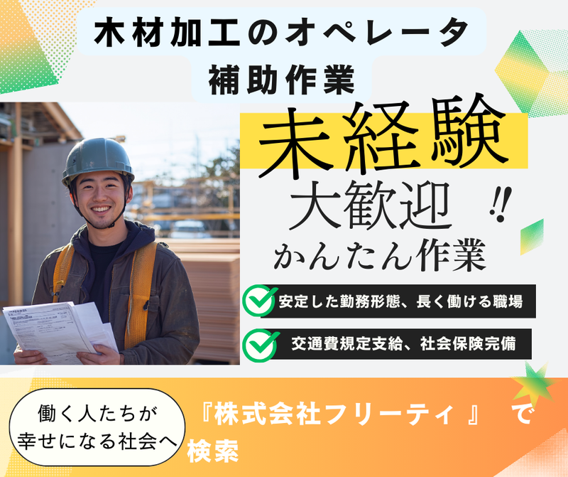 仕事内容 【✨木材加工・カット作業|未経験OK|製造補助|日勤✨】 木材をカット・加工するお仕事です! きれいな工場内で、木材加工・カット作業・製造補助をおまかせします。 【仕事内容】 ・木材のカット補助作業(機械オペレーター補助) ・カット後のチェック、仕分け、梱包 ・未経験でもできるシンプル作業 まずは 補助スタッフ として、先輩のサポートからスタート! 徐々に、カット作業(木材加工機械の操作)も先輩がマンツーマンで教えるので安心です。 未経験大歓迎!