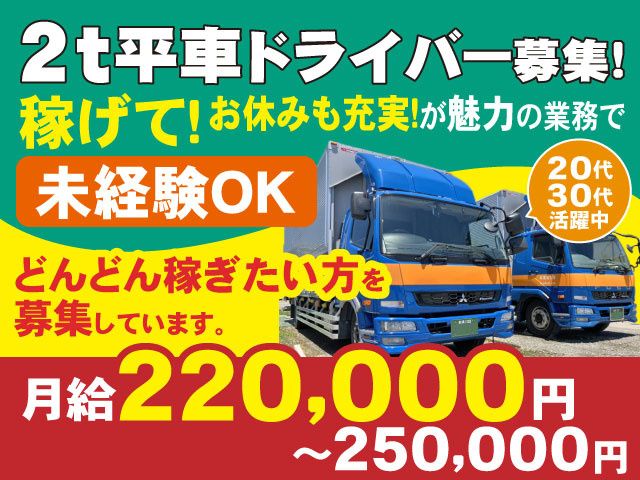 2t平車ドライバー/近県チャーター便 未経験でも月給22万円以上 完全週休2日/朝5時~14時の勤務