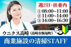インフォメーション 《週2日/扶養内》Wワークや副業に最適!実働3h以内の短時間◇未経験から始めるモール内清掃 ~ スーパーやカフェ等があるショッピングモールでのお仕事です ~ 《 ウニクス高崎 》 気持ちよくお買い物や施設を利用して頂けるよう ショッピングモール内をきれいにするお仕事です♪ 学歴不問・資格不問・経験不問 安定の長期歓迎 1日4h以内OKのパートタイム 残業無し・少なめ+時短勤務+扶養内勤務OK! ワークライフバランスばっちり◎ プライベートタイムも充実できます♪ 中高年・ミドルシニア・アクティブシニア活躍中です \ ご応募お待ちしております / アピールポイント ◎プライベートと両立しやすい (週2日勤務) ◎無理なく働ける短時間勤務 (実働2.5H~3H) ◎午前のみ勤務希望の方相談OK ◎嬉しい扶養内勤務♪ 丁寧に指導しますので 初めての方も安心してご応募下さい♪ \ ご応募お待ちしております /