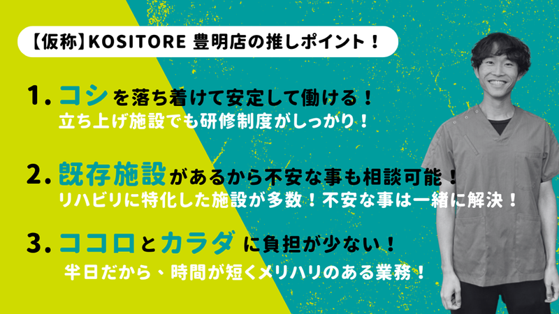 仕事内容 。☆。・*・。☆。・*・。☆。・*・。☆。・*・。☆。 電話番号:052-726-6301 WEB応募は24時間、365日受付中! 。☆。・*・。☆。・*・。☆。・*・。☆。・*・。☆。 2025年11月オープン予定! 「KOSITORE」で、コシを据えて働きませんか? _____________ ⭐KOSITOREのポイント⭐  ̄ ̄ ̄ ̄ ̄ ̄ ̄ ̄ ̄ ̄ ̄ ̄ ̄ ✅半日型デイサービス! 腰痛に特化した半日型のデイサービス◎ 時間が短いから、メリハリをつけて働ける! 1日のデイサービスと違い、 入浴・食事介助がないので、 身体への負担少なめ! ✅安定した働き方が可能! 各種手当や、福利厚生が充実しています♪ ご家庭の急な用事が入った場合も しっかりフォロー! コシを据えて、なが~く働けます! ✅笑顔がやりがいに繋がる! 利用者様が帰るとき、 「今日も楽しかった!」 と笑顔で言ってくれることも。 リハビリに特化しているからこそのやりがいです。 【仕事内容】 通所事業における、 ・リハビリの補助 ・体操 ・送迎 ・軽介助 などをお任せします。 ★入浴・食事介助はありません! <送迎について> 送迎エリア:施設から30分以内 車:普通車(AT車、ハイエース) 「興味はあるけど、コシが引ける…」 まずは見学・相談からでもOK! ぜひお気軽にお問い合わせください♪ ___________ SNS・HP更新中!  ̄ ̄V ̄ ̄ ̄ ̄ ̄ ̄ ̄ ̄ *Instagram* https://www.instagram.com/rehappinessclub?igsh=MXc2MXFnZjRseWJxcw%3D%3D&utm_source=qr *HP* https://rehappiness.com/ *tiktok* https://www.tiktok.com/@rehappinessclub?is_from_webapp=1&sender_device=pc[/qt]