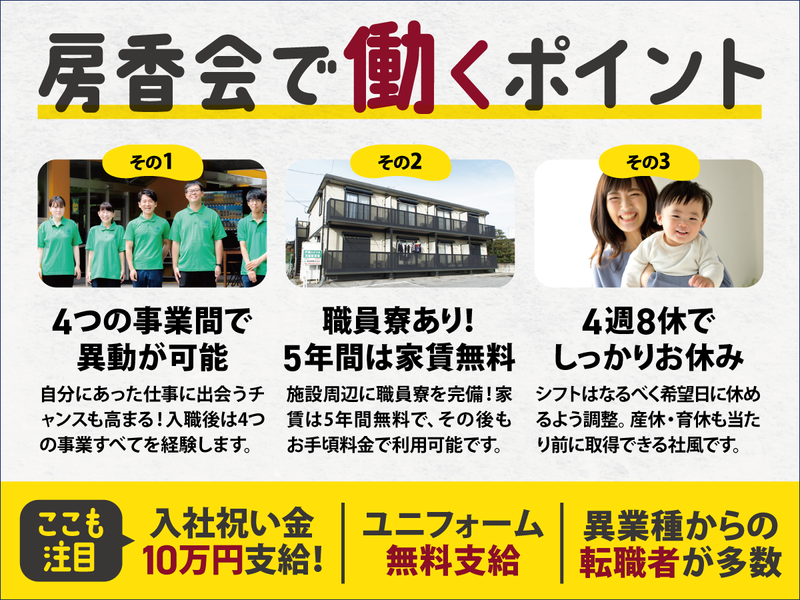 【保険制度】 雇用保険、労災保険、健康保険、厚生年金 待遇・福利厚生 【福利厚生】 《手当》 ・通勤手当(上限:月2万2900円) ・住居手当(月1万5000円) ・宿直手当(1回4000円) ・夜勤手当 ・資格手当 ・超過勤務手当 ・扶養手当 《福利厚生》 ・昇給年1回 ・賞与年2回 ・社会保険完備 ・退職金共済 ・入社祝い金10万円(当法人規定有) ・社宅完備(5年間家賃無料) ※エアコン・冷蔵庫・洗濯機付 ・制服支給 (半袖・長袖ポロシャツ・ブルゾン) ・自己啓発支援 (一定の資格取得者に一時金を支給) ・研修(看護師による実務研修、 栄養士による食事指導、外部研修等)