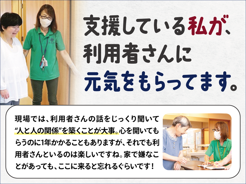 求めている人材 未経験OK!人柄重視の採用です! 《未経験者歓迎/経験不問/無資格歓迎》 ・高卒以上 ・要普通運転免許(AT可) 《1つでも当てはまる方歓迎》 *人と関わる仕事がしたい方 *福祉に興味がある方 *安定した職場で働きたい方 生活支援員・障害者支援員・就労支援員・ 世話人・障害者支援施設・グループホーム・ 社会福祉士・精神保険福祉士・ サービス管理責任者などの経験者歓迎! (正社員はもちろん、短期を含む アルバイト・パート・派遣・業務委託での 経験もOK) ※経験者の場合は前職給与を考慮します。 子育てや介護等でのブランク歓迎・ ブランクOK! 販売・接客・サービス・営業・ 事務などなど、 別業種からの転職も歓迎します! スタッフの内訳:女性23名、男性18名 20代…2名、30代…15名が活躍中です! 20代~30代活躍中! 女性活躍中!