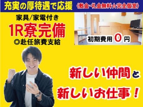 仕事内容 _/_/お仕事について_/_/ パナソニック工場にて、プラスチック製品の原料製造のお仕事をおまかせします! ・原材料の準備や運搬作業 ・製造設備の操作 ・工程検査 ・設備の清掃 など! ー ◆パナソニック工場で働けます! ◆高時給1800円のお仕事♪ ◆生活備品付き1R寮ありで一人暮らし! 【お仕事内容】 大手のパナソニック工場にて、プラスチック製品の原料製造のお仕事をおまかせします! 具体的には・・・ ・原材料の準備や運搬作業 ・製造設備の操作 ・工程検査 ・設備の清掃 など! 未経験からのスタートもOK! 分からないことはすぐに先輩やベテランの方に聞くことができるので安心して働くことができますよ♪ 【オススメポイントはこちら!】 ・月の約半分がお休みでプライベートも充実◎ ・食堂完備でご飯も快適♪ ・長期休暇制度ありでリフレッシュ! 未経験から頑張りたい方や一人暮らしデビューをお考えの方は必見! まずはお気軽にお問い合わせください♪ ご応募お待ちしております! _/_/ココがおすすめPOINT_/_/ ◆パナソニック工場で働けます! ◆高時給1800円のお仕事♪ ◆生活備品付き1R寮ありで一人暮らし! △▼△日払い・週払いOK(当社規定有)△▼△ 急な出費や支払いでお給料日まで待てないという時も安心! スマホでのカンタン登録&申請だけで、 働いた分の給料を給料日を待たずに受け取れる福利厚生サービスです。 _/_/特典・キャンペーン有_/_/ 寮費ずっと無料!(寮費補助制度)