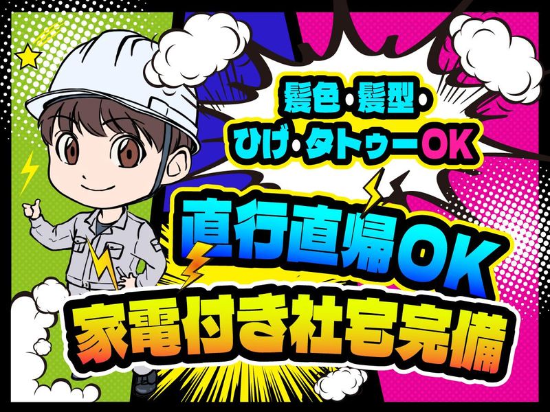 【保険制度】 雇用保険、労災保険、健康保険、厚生年金 待遇・福利厚生 【福利厚生】 ✅社会保険完備 ✅昇給 ✅入社祝金5万円プレゼント ✅家電付き社宅完備※即対応可 ✅社宅限定年末年始等の長期休暇に 食料等の生活必需品支給 ✅資格手当 ✅休日手当 ✅深夜手当 ✅残業手当 ✅資格取得応援joy ✅採用サポート制度 ✅直行直帰OK ✅髪・ヒゲ・タトゥーOK ✅車・バイク通勤OK