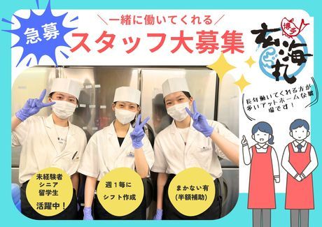 仕事内容 \未経験でも初日から活躍/ 「ブランクがあって不安…」という方も ご安心を!難しい包丁さばきは不要! シャリにネタを乗せる、お皿を洗う等 シンプルな作業を分担して行います! 困った時は職人さんがすぐフォロー チームで動くから一人で焦りません ◎週2日・3h~のシフトで両立◎ ◎1週間ごとのシフト制で自由度抜群! ◎お寿司が全品半額!絶品まかない ◎接客なし!モクモク調理補助のみ ■お仕事内容 【接客一切なし】裏方キッチン業務 注文内容に合わせて、盛り付けたり サイドメニューを準備するお仕事! 以下の5つから、まずは2つを担当! 1.巻物:くるっと巻くコツも伝授 2.軍艦:ネタを海苔の上に乗せるだけ 3.揚げ物:タイマーをピッと押すだけ 4.寿司:簡単な盛り付けからスタート 5.洗い場:手が空いた時にサポート →あなたの特性に合わせてお任せします! ※厨房に寿司職人が2名! アルバイトスタッフに難しい調理を お任せすることはありません。 【午前中3h勤務の例(主婦・シニア)】 09:00 出勤:開店前の野菜カットなど 10:30 開店準備:軍艦のネタを準備 11:00 開店:注文に合わせ盛り付け! 12:00 終了:半額でお寿司ランチ ■実際に働いているアルバイトスタッフの声 「家から通いやすくて応募しました。 回転寿司は初めてでしたが、社員さんが 優しくて、気づけば長く続いてます 仕事前に半額でお寿司を食べるのが 毎回の楽しみなんです!(60代女性)」 ■2023年8月はテレビでも紹介されました! 【活気があるけど落ち着いたお店】 ジャズが流れる店内はゆったり空間。 常連様も多く、穏やかな雰囲気です。 50代~60代のベテランも多数活躍中! お孫さんにお小遣いをあげるために 楽しく働くシニア世代も多いですよ 【玄海丸だけの3つの強み】 1.プロの目利きが選ぶ最高の魚 2.自社開発の醤油・酢で唯一の味 3.季節ごとの限定メニューが豊富 価格以上の価値を届けるお店です!