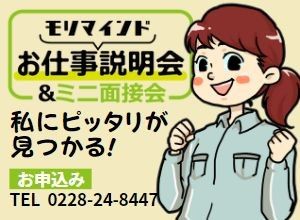 選考手順 ◆WEB応募の場合 「応募する」ボタンからご応募下さい。24時間いつでもOK!応募情報のみの入力でかまいません。 ◆電話応募はさらにカンタン 応募受付TEL 0228-24-8447 (月~金/午前8:30~午後6:56) ※祝日可 面接地 ◆株式会社モリマインド 宮城県栗原市築館青野8-10 TEL 0228-24-8447 ※WEB面接始めました ご希望の方は、お気軽にご相談ください。