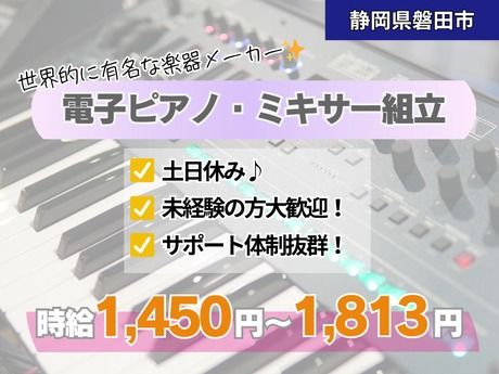 仕事内容 【仕事内容】 《アピールポイント》 ・昇給制度あり(時給+100円、年収約20万円UP) ・空調完備の良環境 ・日勤のみ、土日祝休み ・未経験歓迎 ・髪色自由 ・ネイル・ピアス可 ・退職金制度あり ・日払い相談可能 《電話応募》 053-489-6001までお問い合わせください。 《お仕事データ》 仕事の難しさ:★★☆☆☆ 残業の多さ:★★☆☆☆ 職場環境:★★★★★ 休みの取りやすさ:★★★★☆ 定着率:★★★★★ 昇給しやすさ:★★★★★ - 世界的に有名な楽器メーカー工場でのお仕事です。 電子ピアノ・ミキサーの組立・梱包・検査業務をお願いします。 男女共に活躍中、未経験OK、モクモク集中作業です。 教育体制が整っている為、未経験でも安心して作業することができます。 業務は直接雇用の社員と変わらない内容となります。 程よい難易度で快適な職場環境を求めている方にマッチングする案件です。 弊社定着率No.1の職場で働きませんか? まずはお気軽にお問い合わせください♪ - 【月収例】261,000円+交通費規定支給 (時給1,450円、20日勤務、残業20時間の場合) *冷暖房完備 *社員食堂利用可能 *未経験OK *社会保険即日加入OK *昇給制度あり ※規定有り *日払い可能 ※規定有り *フルタイム勤務 *全面禁煙(駐車場も不可)