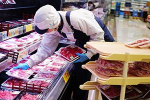 スーパーの精肉コーナーでのパック詰め・品出しスタッフ