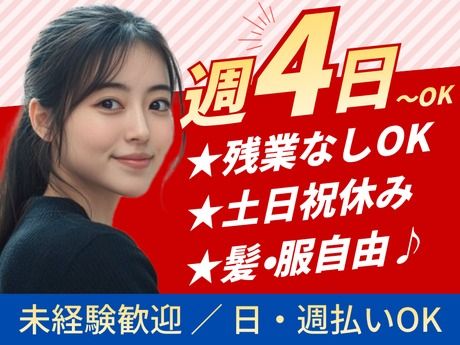 固定時間制 勤務時間 シフトサイクル:1週間 9:30~18:00(休憩1h) ◎週4日~OK ◎土日祝休み ◎定時勤務OK! 残業をされない方も多数在籍していますので、帰りずらい雰囲気はありません! 残業が少なめなので退社後は自分の時間を楽しむ方が多数。 家族や友達と過ごす時間もしっかり確保できます。