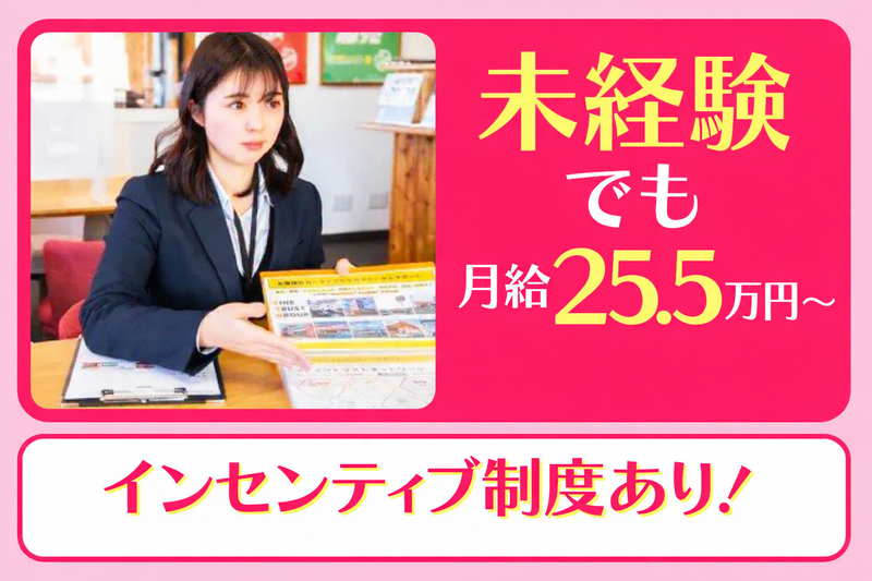 仕事内容 《 そのままの自分で働ける職場です 》 ⭐ネイル・ピアス・髪色自由! ⭐未経験OK ⭐月給 25.5万円 〜+賞与年2回 「仕事もオシャレも大切にしたい」 「自分らしい服装・髪形で働きたい」 そんな方を全力で応援します! ✨自動車買取・販売店の 営業アシスタント業務 バックオフィス業務を通して、 営業スタッフのサポートをお任せします◎ 《 具体的には 》 ・お客様からのメール対応 ・営業へ繋ぐまでの初期対応 (電話・来客) ・契約後のデータ入力、書類管理 ・納車までの段取り管理 ・お客様への書類説明 などを 営業がスムーズに回るように サポートする大切なポジションです。 「人をサポートするのが好き」 「喜ぶ顔が見たい」 そんな方にもピッタリのお仕事! 《 未経験でもOK 》 丁寧な研修制度あり◎ 仕事のやり方も、 クルマの知識も身に付きます! アパレル・美容業界から 転職してきたスタッフも活躍中◎ ⭐プライベートも充実させやすい環境 ◆月8日以上休み ◆月に1回土日祝の休みも可能 ◆お盆と年末年始に連休あり ◆有給取得率90%以上 ワークライフバランスを大切にしながら、 長く安心して働けます。 20代・30代のスタッフが多数在籍。 フラットで話しやすい雰囲気です。 《 業績好調!安定基盤の成長企業 》 25年9月には【売上高152億円】を突破! 創業以来、右肩上がりで成長しています。 将来性もバツグン! 安定基盤だから待遇面も充実しています◎ 未経験でも月給25.5万円~! 服装・ピアス・髪色自由! あなたらしさを大切にしながら しっかりキャリアアップできる環境です。 頑張りを正当に評価し 昇給につなげます◎ 賞与も年2回! 今より高収入を目指したい方にも ピッタリの環境です◎ 《 先輩の声・届いてます 》 前職は学生時代からの夢だった アパレル系の仕事をしていましたが シフト制で勤務時間や 休日が不規則で…。 身だしなみに関する制限も厳しく、 「好きなことをしている」という 実感が持てないまま働いていました。 そうして転職活動をしているときに 出会ったのがファイントラストでした。 『ネイル・ピアス・髪色自由』と 求人に書かれているのを見て、 思い切って面接にも自分の好きな コーディネートで行ってみたところ、 ウケがよかったのが嬉しくて…(笑) 入社してからも先輩やお客さまから ファッションを褒められることもあって、 日々満足しながら働けています! 《 カジュアル面談実施中 》 お互いのことを知るために 面談を実施中です。 堅苦しい雰囲気ではなく、 お話しできたらと思います。 お気軽にお問い合わせください。