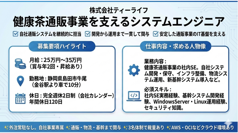 仕事内容: ■業務概要 「メタボメ茶」「プーアール茶」「ルイボスティー」などの健康茶商品の通販事業を支える社内システムエンジニア。自社システムの開発・保守、インフラ整備、物流センターシステム運用、新基幹システム導入など多岐にわたり携わります。 ■対象 ・自社EC・通販システム ・物流センター業務システム(WMS) ・新基幹システム導入プロジェクト ・社内インフラ ■業務内容 ・自社スクラッチ通販システムの改修・更新・保守運用 ・物流センター業務システムの運用・管理 ・社内インフラ整備(Windows/Linux環境、セキュリティ対策) ・社内ヘルプデスク業務(社内IT全般の問い合わせ対応) ・新基幹システム導入プロジェクトの企画・推進(グループ会社との情報共有強化、業務効率化) ■環境 ・ASP.net、C#.net、PHP、SQL、Excel VBA ・VisualStudio ・Windows、Linux ・Oracle、SQL Server、PostgreSQL ・WEBブラウザDevTool、Oracle SQL Developer、SSMS、Microsoft365、AWS、OCI ■体制 ・情報システム部配属。現在3名体制(30代1名、40代1名、50代1名)