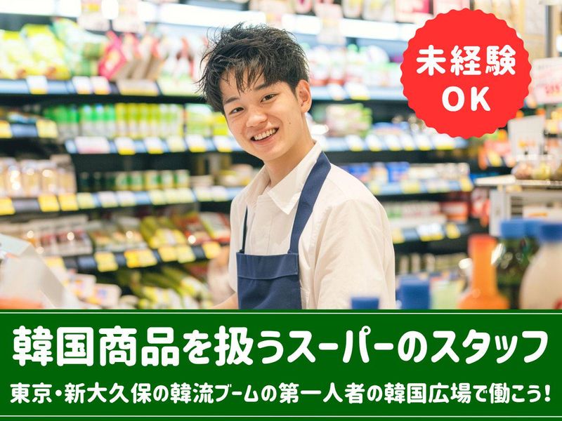 仕事内容 【仕事内容】 韓国食品スーパーにて、 レジや商品の 陳列・在庫管理をお任せします。 みんな一緒のスタートで安心◎ ✨体を動かしながら働きたい方に必見! ✨接客未経験の方でもOK! ✨20代~30代の若い層を中心に活躍中! ================== お店に来店されるお客様も温かくて 接しやすい方が多く、 店内はとても和やかな雰囲気です。 常連さんが来店されると、 「〇〇さん、今日もがんばってるね!」 と声をかけてくれることもあります! ================== << 韓国広場のご紹介 >> 韓国広場は韓国の食、文化、心を届けます。 東京・新大久保の韓流ブームの第一人者! 韓国広場は韓国の生活文化をサポートする 日本最大級の韓国スーパーです! 韓国食材の大半を韓国から直輸入! また、韓国食材のみならず、 韓国の食器や生活用品など 幅広いラインナップを揃えています。 ==================