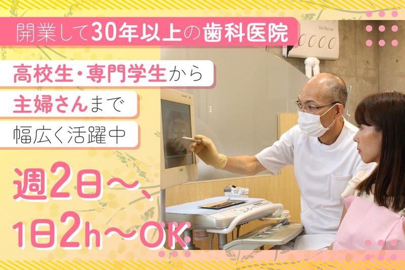 仕事内容 *・:・*・:・*・:・*・:・*・:・*・:・*・:・*・ <巽南の地域に愛され続けて30年以上> 少人数の和やかな歯科医院! 無資格・未経験からスタートできる 歯科助手・受付事務のお仕事です♪ ◆週2日~・ 1日2時間~OK ◆歯科衛生士を目指している学生さん大歓迎 ◆初パートやアルバイトデビューも応援 ◆ゆくゆくは社員になりたい人も大歓迎 *・:・*・:・*・:・*・:・*・:・*・:・*・:・*・ <仕事内容> 歯科助手・受付事務全般◎ ・患者さんの受付やご案内 ・器具の消毒や滅菌 ・院内の清掃 などをお任せします。 <募集背景> 今いるアルバイトさんがこれから 歯科衛生士の専門学校に通うため 欠員での募集です。 ……………………………… ★未経験スタート大歓迎! ……………………………… アルバイト自体がはじめての方も 歯科の知識がない方も大歓迎です◎ 働きながら学んでいける環境なので 資格も必要ありません。 まずは先輩スタッフが隣につきながら ひとつずつ丁寧に教えていきます。 いきなり患者さんの対応をお任せする なんてことはありませんのでご安心ください! ”最初は誰でも未経験”と思っているので あたたかく見守っていきます。 あなたのペースで、 ゆっくり慣れていってくださいね(*^^)v ………………………………… ★高校生&学生さん大歓迎! ………………………………… 「将来は歯科衛生士の仕事をしたい」 「高校を卒業したら衛生士学校に進学予定」 そんな夢を持つ学生さんを歓迎します! 今いるアルバイトさんも 専門学校に通っている方が3名在籍。 そのうちの2名は高校生の頃から働いてくれています。 同じ目標を持つ仲間と一緒に働けるので モチベーション高くお仕事できますよ◎ 午後勤務大歓迎!学校終わりに働きやすい♪ 「テスト期間」「実習」「部活動」 など、学校との両立に配慮したシフト体制です◎ - <当院について> 生野区巽南で開業して 30年以上の実績がある歯科医院です。 郊外の住宅地の中にあるので とても静かな雰囲気で落ち着いています。 地元の方を含む高齢の方が 多く通ってくださっており スタッフは若い世代が多いこともあり 優しく温かく見守ってくださる方ばかり。 孫を見るような目で接してくださいます。 そんな患者さんと顔なじみになって 会話を楽しむことができる アットホームな空間です◎ <職場の雰囲気> ★院長と4名のスタッフが在籍! ★10代~40代前半の女性が活躍中! ★定着率抜群◎勤続6年以上の方も活躍中! 未経験から始めた方も多く みんな仲良くチームワークはバッチリです。 助け合って仕事をしているので とても働きやすい環境です。 万全のサポート体制で迎えるので 安心してスタートしていただけます♪ 。**お電話での応募も大歓迎です!** 。 お気軽にご応募下さいね! [TEL]06-6753-6482 ※営業電話はお控えください