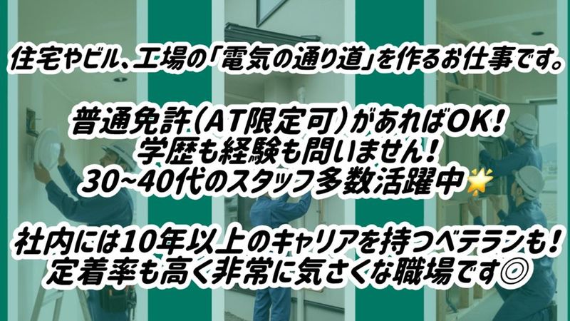 求めている人材 【必須条件】 ・普通自動車運転免許(AT限定可) ・年齢制限:64歳以下 (定年が65歳のため、長期勤続によるキャリア形成を図る目的です) 【あれば尚可】 ・建築・建設業界での経験がある方 ・第二種電気工事士お持ちの方(技能手当などでしっかり優遇いたします) 学歴/経験不問!未経験者も歓迎しております! 年齢の条件と理由:あり(例外事由1号・65歳未満(定年のため))