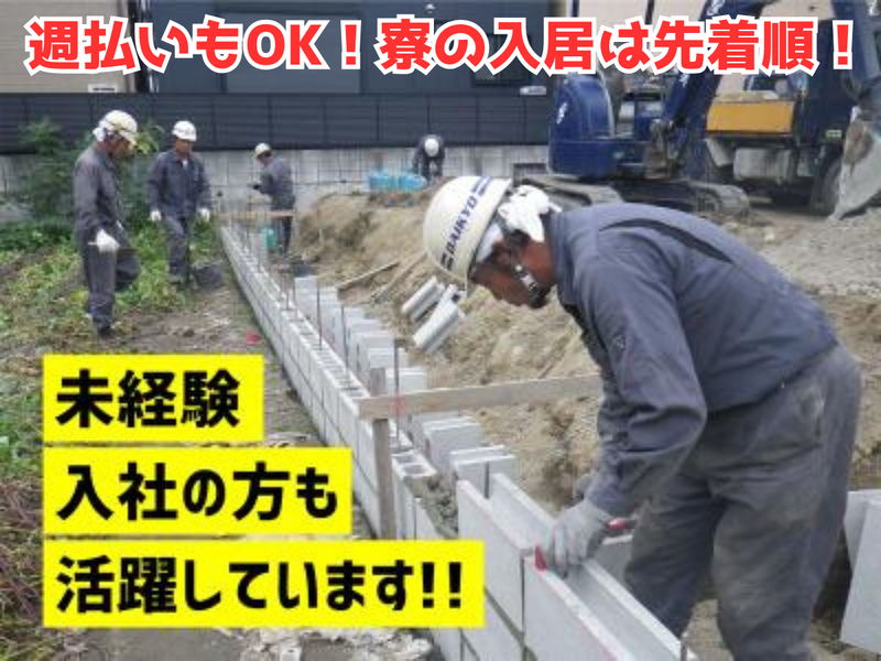 仕事内容 ⭐今なら社員寮が【1室のみ】空いています ⭐早い者勝ちで、すぐに入寮OKです! _/_/_/_/ ここがポイント _/_/_/_/ ★履歴書不要!即面接×即勤務OK ★寮完備&週払いアリで安心! _/_/_/_/_/_/_/_/_/_/_/_/_/_/_/ / 『大共』は頑張るあなたを 応援し続けます!! \ 「従業員を守ること」をモットーに 社長自らが徹底的に従業員をサポート! 困ったことや気になることがあれば、 社長が現場に出向いて解決まで導きます。 スタッフ想いな会社で働くなら『大共』へ! <仕事内容> 一般土木工事現場での 手元作業をお願いします。 <具体的には> ・用具や道具の準備や片付け ・資材の運搬 ・簡単な軽作業 など <主な勤務地> 名古屋市近郊 *元請け会社が多く、 外構工事や復旧工事をはじめ、 道路工事・舗装工事など 様々な現場があります。 年間を通して業務量が安定しているので 「明日は仕事があるのかな...?」 なんて心配は不要です! 【事業内容】 土木工事業 【雇用形態】 アルバイト・パート