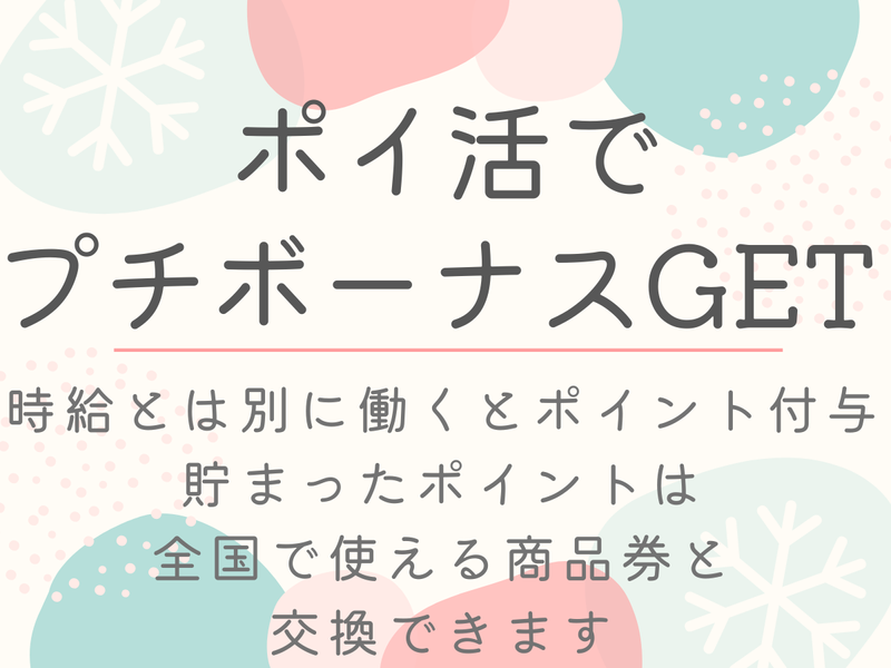 【保険制度】 雇用保険、労災保険、健康保険、厚生年金 待遇・福利厚生 【福利厚生】 ・有給あり ・昇給あり ・産休育休 ・健診あり ・私服勤務(店舗による) ・インセンティブあり ■特別な福利厚生アリ ポイント貯めて商品券と交換できる プチボーナス付 時給とは別に1時間ごとに1ポイント (5円)が自動付与されます★更に お友達を紹介いただくと800P付与 (4,000円)貯まったポイントは商品券 に交換いたします(^^)/