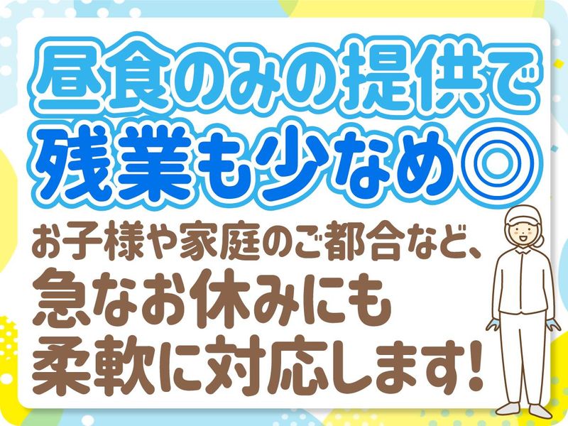 仕事内容 *家事の延長のようなカンタン作業♪ *社員食堂なので日曜休み!大型連休あり! *パートさんでも賞与年2回支給♪ ✅東証プライム市場上場企業の 100%子会社で安定して働きませんか? ご応募はお電話でもOK! 06-6205-7818(採用担当まで) 「音羽の求人を見た」とお伝えください。 【具体的には】 グループ企業の工場内社員食堂で昼食の ・仕込み ・盛付 ・提供 ・洗浄 ・片付け など 調理補助のお仕事をお願いします。 *提供メニューは 鶏の唐揚げ、うどん、鮭のちゃんちゃん焼き、 トンテキ、ビビンバなど。 *A・B・Cの定食と小鉢を提供しています。 *5名体制での作業 *工場のランチ営業で対面販売を行います。 難しい調理スキルは不要! 料理の盛り付けや、野菜を切る作業が中心です。 先輩スタッフが丁寧にお教えしますので、 ご安心くださいね。 和気あいあいとした雰囲気で、 子育て中の主婦さんも多数活躍中! お互いに助け合いながら働いています。 【未経験からスタートできます!】 調理の経験はなくても⼤丈夫! 家事の延⻑でできるお仕事です。 料理が得意な⽅や調理経験がある⽅は もちろんスキルを活かしていただけます♪ 働いているうちに どんどん料理の腕も上がっていきます◎ 未経験の⽅でも安⼼して始められるように 研修制度もご⽤意しています。 いきなり⾊んなことをお任せすることはありません︕ 働きながら徐々にできることを増やしていきましょう。 【働きやすい環境】 夏季・GW・年末年始と長期休暇があり プライベートも大切に働ける環境です。 ・有給休暇は消化率70%以上 ・福利厚生(インフルエンザ予防接種費補助など)も充実 社員食堂のスタッフはみんな明るく、 アットホームな雰囲気なので、 すぐに馴染んでいただけます。 【年末年始のご応募対応について】 12月27日~1月4日は冬季休業となります。 その間にいただいたご応募に関しては、1月5日以降にご連絡いたします。