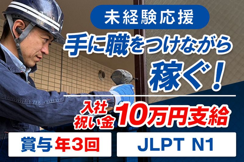 【アピールポイント】 \未経験から手に職をつけ給与UP/ 集合住宅設備のリフォームスタッフを正社員募集! 【必須】普通自動車免許(AT限定可) □未経験OK・学歴不問 □賞与年3回(昨年実績約5カ月分) □資格取得支援あり(全額会社負担) □キャリアアップ可能(リーダー・管理職登用あり) □基本残業少なめ(月平均5h) □入社祝い金10万円支給