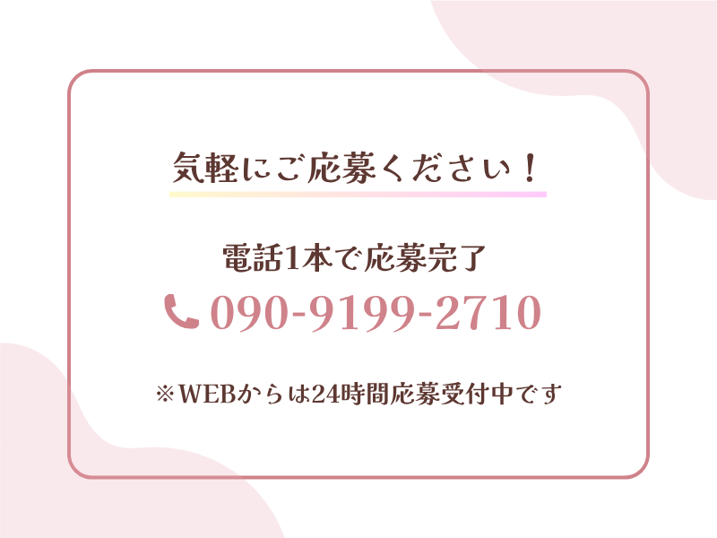 選考プロセス 電話(090-9199-2710)または WEBにてご応募ください。 面接は普段着でOKです。 女性オーナーが丁寧にお話を伺います。 仕事内容や働き方など 不安なことはお気軽にご質問ください。