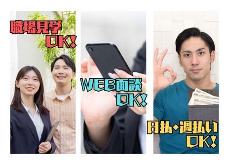 【保険制度】 雇用保険、労災保険、健康保険、厚生年金 待遇・福利厚生 【福利厚生】 【社会保険】 健康保険、厚生年金保険、雇用保険、労災保険 【福利厚生】 ・交通費規定支給(公共交通機関は全額支給♪) ・有給休暇(6ヵ月以上勤務) ・健康診断(規定) ・ストレスチェック(規定) ・制服貸与 ・ロッカーあり ・日払い・週払い・前払いOK(規定あり) ※システム利用による土日祝は利用不可になります。 ■WEB面談実施中! ■受動喫煙防止措置:施設内原則禁煙(喫煙所有)