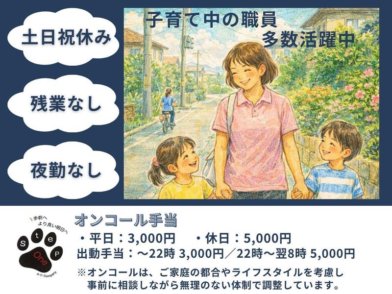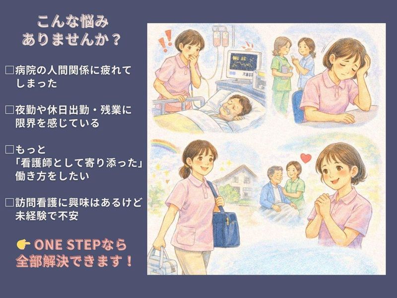 仕事内容 ー 事業拡大+産休・育休に入る スタッフがいるための 【増員募集】です ー 子育て世代が多く、急なお休みも「お互いさま」で支え合える環境。 病院とは違い、1人ひとりに寄り添う看護ができます。 <仕事内容> 提携姉妹法人の障がい者施設利用者様を中心に訪問。 環境が整っているため、訪問未経験の方も安心です。 主な業務 ・バイタルチェック ・服薬管理 ・医療処置 ご家族への助言・サポート 記録業務(スマホ・タブレット) 訪問件数:1日約6件 訪問エリア:東村山市・小平市・入間市・狭山市・所沢市 ほか ※社用車あり(AT限定OK) <訪問未経験でも安心> ・最初は必ず同行訪問 ・不安な点・苦手分野に合わせて段階的に調整 ・ブランク明けのスタッフも多数活躍中 「いきなり1人で任される」ことはありません。 <One stepが選ばれる理由> ◎ 人間関係のストレスがほぼゼロ 訪問は基本1人。 病棟のようなギスギス感や無理な気遣いはありません。 ◎ 子育て世代が多数在籍 急な発熱・学校行事も柔軟対応。 「休みにくい空気」は一切なし。 ◎ 土日祝休み × 年間休日125日 家庭・プライベートとの両立がしやすく、 長く働くスタッフが多い職場です。 ◎ 残業ほぼなし(月2時間程度) 記録はスマホ・タブレットでスキマ時間に入力。 持ち帰り業務ナシ。 ◎ オンコールは“持てる日だけ” 家庭状況に合わせて相談しながら調整。 無理な割り振りはしません。