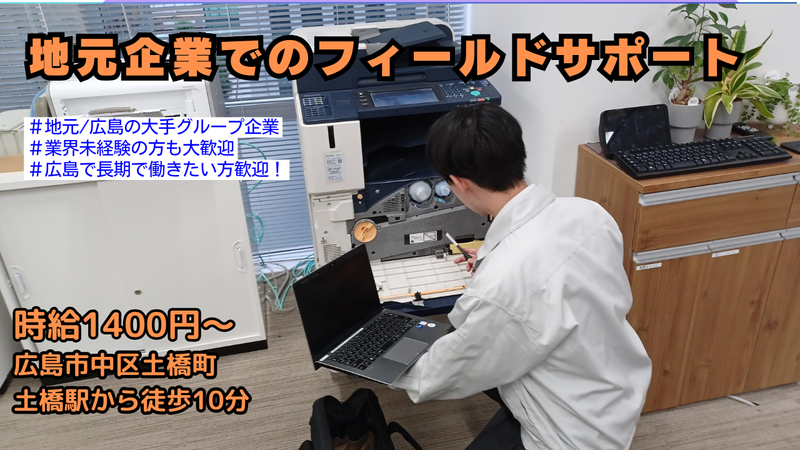 ■仕事内容 地元通信企業でのユーザーサポート業務をお願いいたします。 【業務内容】 ・インターネットやWi-Fi接続に関する初期設定や操作説明 ・訪問先での機器の確認 ・簡単な設定サポート お客様宅を訪問して設定を行いますが、作業はマニュアルに沿った内容で、難しい対応などは専門部署が対応します。 まずは先輩と同行して業務を覚えていただきますので、未経験の方も安心して始めていただけます。 【アクセス】 ・広島電鉄 土橋駅から徒歩5分 ・広島電鉄 十日市町駅から徒歩10分 ・バス停 河原町から徒歩5分 【下記の経験がある方は歓迎】 ヘルプデスク、サポートデスク、社内SE、ユーザーサポート、 カスタマーサポート、ネットワークエンジニア、インフラエンジニア、 コールセンター、データ入力、問い合わせ対応、パソコン組み立て、 パソコン修理、故障対応、オペレーター、システムサポート 【こんな人にオススメ!】 ・長期のお仕事をお探しの方 ・コミュニケーションをとりながらお仕事が好きな方 ・IT業界に興味のある方 勤務開始時期: 即日勤務可能 ■仕事の特徴 駅チカ・駅ナカ 即日勤務OK フルタイム歓迎 学歴不問 未経験・初心者OK 資格不問