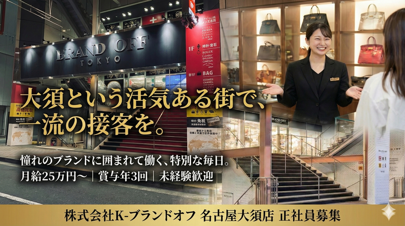 概要 買取スタッフ 募集職種 販売スタッフ・接客 雇用形態 正社員 募集内容 この求人のポイント 買取スタッフ/未経験OK/賞与あり/完全週休2日制/名古屋市中区/eaf82b84a0326ab2名古屋大須 未経験から査定スキルが身につく 買取スタッフ おすすめポイント: ■移動にかかる交通費支給(規定あり) ■安心して働ける社会保険完備 ■未経験者歓迎のフォロー体制 ■しっかり学べて安心の研修あり ■制服ありなので用意は不要 ■お得に買い物できる社割あり 勤務地: 愛知県名古屋市中区大須3-24-44セントラルスクウェアB1F、1F 勤務先: BRAND OFF 名古屋大須店 アクセス: エレベータ出入口から 徒歩5分 大須観音駅 業種・業界 小売業(アパレル等) 必須スキル・経験・資格 求めている人材 経験不問。ブランド知識は入社後に学べます ・接客・販売・営業経験がある方歓迎(業界不問) ・ファッションやブランドが好きな方 ・地道にコツコツ取り組める方 ・将来バイヤーや店長を目指したい方 ※第二新卒/20代・30代活躍中 エントリーフォームよりご応募ください。 備考欄に ・前職のポジション ・今までのキャリア ・ご経験 をご記載ください。 受動喫煙防止措置条項 喫煙所:喫煙所あり(屋外)