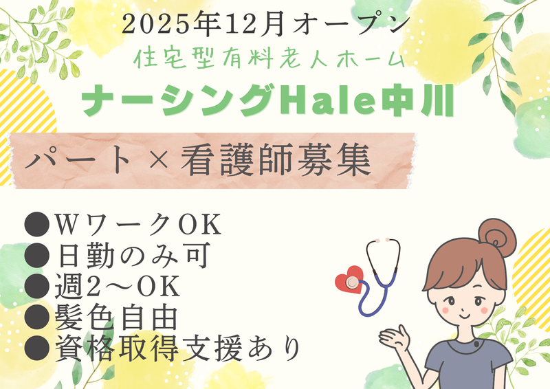 仕事内容 ☆☆☆☆☆☆☆☆☆☆☆☆☆☆☆☆☆☆ ✨まずは気軽に会社案内を聞いてみたい! ✨職場見学をしたい! WEB応募は24時間、365日受付中! ☆☆☆☆☆☆☆☆☆☆☆☆☆☆☆☆☆☆ 2025年12月、名古屋市中川区に「住宅型有料老人ホームナーシングHale中川」がオープンします✨ 当施設名の「Hale」はハワイ語で「家」。利用者様やそのご家族にとって、心から温かく、親しみを感じていただける「第二の家族の家」でありたい。そんな想いを込めています。 運営会社である株式会社コー・イングの社名「Co(共に)、ing(〜する)」には、従業員一人ひとりの個性や強みを活かし、それぞれの夢の実現に向けて、みんなで協力し合いながら進んでいきたいという願いが込められています。 私たちは、利用者様とそのご家族に「ナーシングHale中川に出会えて本当に良かった!」と感じていただくことを目指しています! そして、いつかそのご家族が「将来自分もここに入りたい」、お子さんが「ここで働きたい」と願うような、そんな誇れる施設をあなたの力で共に創り上げていきたいと考えています。 【代表からのメッセージ】 あなたの意見やアイデアが、この「Hale中川」の温かい雰囲気、最高のサービスに直結します。 また、単なる介護ではなく、利用者様とそのご家族の人生に深く寄り添い、希望に満ちた未来をサポートする、かけがえのない役割です。 フラットな関係性でお互いを尊重し意見を出し、協力し合いながら一緒により良い施設にしていきたいと考えています! 利用者様とご家族、そしてあなた自身の未来を一緒に彩りませんか? あなたの素晴らしい個性と情熱を、ぜひここで活かしてください。 ご応募、心よりお待ちしております。 【仕事内容】 施設内にて、看護業務全般をお任せします。 ○健康管理 ○医療対応 ○バイタルチェック ○ご利用者様とのコミュニケーション ※オンコール対応なし 弊社では、ご利用者様とのコミュニケーションを大切にし、 生活に楽しみを持てるようにサポートすることを目標にしています。 介護スタッフや往診医と連携しながら、ご利用者をサポートしていきましょう。 ⭐経営理念⭐ 「共創」 〜理念に込めた想い〜 従業員、利用者様、ご家族、取引先、地域住民などステークホルダーと共に協力しながら、より良い社会や一人ひとりの幸せの形を創り出す。