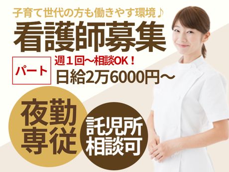 仕事内容 運営法人について ━━━━━━━ 医療法人毅峰会 ━━━━━━━ 「小さくても、大病院にない温かく心のこもった、どこにも負けない医療を提供できる病院を、我々で創ろう」と創立いたしました。 【事業内容】内科・消化器内科・循環器内科・呼吸器内科・皮膚科・放射線科・血液内科・整形外科・泌尿器科 就業先施設について 全78床病棟 ■内科、整形外科等を行っている病院 ■入院患者は、平均55名(2病棟) <通勤方法・その他補足> ※車通勤可(駐車場あり:自己負担3000円/月) ※送迎バスあり(行きAM8:00/帰りPM5:45) <受動喫煙対策> あり(屋内禁煙) ■受動喫煙対策に関する特記事項 全館禁煙 <新型コロナウイルス感染防止対策実施> マスク着用での勤務、アルコール消毒液完備などの感染対策をし、利用者様もスタッフも守れるよう体制を整えています。 病院/病棟での看護業務全般 <主な業務> ・健康チェック ・服薬管理 ・医療処置や機器管理 ・療養上の看護 ・医療、介護の相談 ・ターミナルケア ・リハビリ など ここがポイント♪ ━━━━━━━━━━━ パートさん募集 ━━━━━━━━━━━ ■病棟で働く看護師(看護職員/看護スタッフ)さん募集♪ ■看護師/准看護師の資格をお持ちの方を募集しています。 ■経験が浅い方からベテランさんまで幅広く募集しています ■入職後は、紹介先施設の直接雇用(パート)としての勤務となります ━━━━━━━━━━━ うれしい高日給! ━━━━━━━━━━━ ■看護師:日給2万8000円 ■准看護師:日給2万6000円 ■その他、待遇・手当充実! ■託児施設利用相談可能 ━━━━━━━━━━━ 夜勤専従のお仕事です♪ ━━━━━━━━━━━ ■実働14時間、休憩2時間 ■週1回勤務より相談OK ■月4~5回勤務できる方歓迎 ■残業はほとんどありません ■土日祝が出勤できる方、大歓迎 求職者様の手数料・費用負担ゼロ!応募から就業開始まで、あなたの転職をサポートします♪ ━━━━━━━━━━ 有料職業紹介について ━━━━━━━━━━ 有料職業紹介とは、人材を必要とする企業様から求人依頼を受け、紹介会社がその企業に見合った求職者様をご紹介するサービスです。 「有料」と聞くと、「応募したらお金がかかる」と思っていませんか?それは間違いです! 求職者様には紹介手数料や費用など、料金は一切発生しませんので、どうぞ安心してご応募ください。 ━━━━━━━━━━━━━━ 他にもいろんなお仕事をご用意♪ ━━━━━━━━━━━━━━ ■未経験OKのお仕事 ■平日のみ・土日祝休みや長期休暇ありのお仕事 ■高収入・高時給のお仕事 ■日勤のみのお仕事 ■短時間・時短のお仕事 ■夜間・深夜・夜勤専従のお仕事 ■残業なし・学歴不問・正社員登用・急募のお仕事 ■主婦・主夫が活躍できるお仕事 ■子育てと両立できるお仕事 ■60歳以上のシニアさん歓迎のお仕事 など