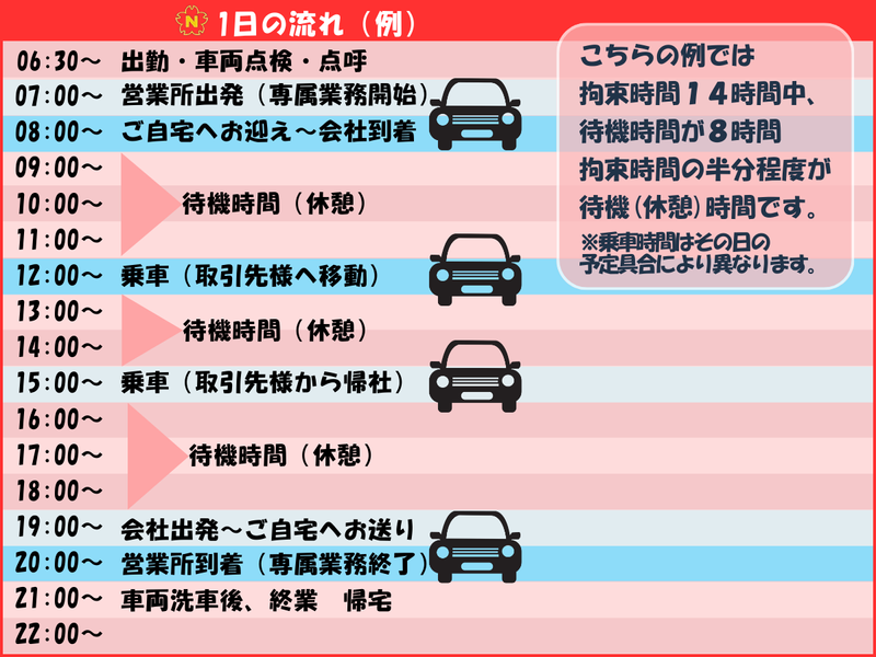 仕事内容 ┈┈┈┈┈◦✩◦┈┈┈┈┈ お電話応募も受け付け中です! 下記番号迄ご連絡ください♪ ☎03-626-6419 「Indeedの求人を見た」と お伝えください! ┈┈┈┈┈┈┈┈┈┈┈┈┈ =タクシーから、ハイヤーへ= 「運転の仕事」が、 ここまで変わるとは思いませんでした。 日本交通で、タクシー乗務員として2年。 その後、ハイヤー事業部から声がかかり、 ハイヤー乗務員を経験した社員がいます。 「同じ“運転の仕事”なのに、ここまで 世界が違うとは思わなかったですね。」 - ■ ハイヤー乗務員の仕事って、何が違う? 一番の違いは“お客様との関係性”。 タクシーは > 「どちらまで行かれますか?」 ハイヤーは >「本日は〇時にこちらへお迎えし、 〇〇へお送りする予定でございます。 お食事のあとは、○へお送りいたします。 ご予定にお間違いは ございませんでしょうか?」 ――すでに“目的地”も“スケジュール”も 決まっているお仕事です。 お乗せするのは、 * 上場企業の役員 * 自治体のトップ * テレビで見るような著名人 落ち着いた方ばかりで、 トラブルはほぼありません。 「怒鳴られた」「理不尽に絡まれた」 そんな経験とは無縁の環境です。 - ■ 未経験でも大丈夫な理由 皆さん最初は完全未経験から スタートしています。 * 地理はどう覚える? →東京地理試験+実務で自然と身につきます *マニュアルはある? → 完璧な「顧客ファイル」が存在します。 道はもちろん、お客様に好まれる 座席の角度、車内温度、話し方迄 記載がございます。 - ■ 印象に残っているエピソード 空港送迎で、事故渋滞に巻き込まれたとき。 到着が間に合わないことをお伝えすると―― 「大丈夫ですよ。次の便と、 その次の便まで押さえてありますから」 怒られるどころか、気遣われた。 これがハイヤーの世界です。 ■ こんな方に向いています * 接客の質を大切にしたい * 落ち着いた環境で働きたい * 運転の仕事を“一段階上”にしたい * タクシー経験を活かしたい * 未経験だけど、丁寧な仕事がしたい 「運転は好き。でも、今の環境には正直疲れている」 そんな方にこそ、知ってほしい仕事です。 まずは話を聞くだけでも構いません。 あなたの“次の選択肢”として、 ハイヤーという道を。 \【WEB面接】実施中!/ 応募開始から完了まで約1分♪ ✅赤坂・銀座・日本橋勤務です♪ 店長から転身している社員続出⁉ ノルマなし、数字に追われない、 心に余裕ができたと大好評です◎ =================== 接客と運転のみ!!!! =================== 【安定保証】✅月給40万円 【経験不問】✅未経験者9割以上 【研修充実】✅安心スタート 【運転時間】✅実質1日4時間 【仕事内容】✅接客&運転のみ ◆当社“日本交通”について◆ ・:・:・:・:・:・:・:・:・:・:・:・:・:・:・:・:・:・ ドライバー数、車両保有数 ⇒共に【業界最大規模】!! 自社で【研修センター】を保有! ⇒業界最大手企業の充実研修✨ ▛▝▝▝▝▝▝▝▝▝▝▝▝▝▝ ▜ ◆研修内容をご紹介◆ 期間 :約1カ月半 導入研修 :運転の基礎知識 同乗研修 :実際に乗務体験 細かい所作、美しい運転技術、 東京都の地理、主要ルートなど 身につけられる内容です。 ▙ ▖▖▖▖▖▖▖▖▖▖▖▖▖▖▟ ★元店長&業界未経験入社 先輩社員の声をご紹介(52歳) ≡≡≡≡≡≡≡≡≡≡≡≡≡≡≡≡≡≡ 最後の転職先としてもぜひ♪ 元々接客が好きで、アパレル業界の 接客業に励んでいました。仕事を 重ねていくにつれて、マネジメントや 売上管理、クレーム対応に在庫管理など 好きな接客以外にとられる時間が 多くなり、転職を決意しました。 このお仕事は、最後までお客様に ひたむきに向き合うことが出来るので 今はやりがいを胸にお仕事をしています。 さらに、店長職ではなかなか休みが 取れませんでしたが、今では週休2日が キープできているので、身体も健康に なりました。接客でここまで給与が 高水準で安定していることも とても魅力的です。いいことばかり 言って、うさん臭く感じられるかも しれませんが、ぜひ一度応募して 話を聞いてみてください。 こんな世界もあるのか、と新しい 発見につながりますよ! ━-━-━-━-━-━-━-━ 【仕事内容】 「ハイヤー運転手・役員送迎」 法人契約している企業様の 役員の方や、スペシャルゲストを 目的地まで送り届けるお仕事です。 運転時間:1日4時間程度。 待機時間: 目的地までの経路を確認し コンビニの場所や喫煙所など お客様に必要な情報もリサーチ! 待機中は、読書・仮眠などもOK! 運転する車両: センチュリー/レクサスLS/クラウン、 クラウン・マジェスタ/レクサスES、 アルファード・ハイエース等 ※お客様の車両(外国産車等)を 運行していただくこともあります。 ━-━-━-━-━-━-━-━ ⌛1日のスケジュール例⌛ ▼ 8:30 出社、スケジュールと車両確認 ▼11:00 お客様先へ。目的地へ送迎。 ▼12:00 目的地から戻り1件目終了 ▼13:30 昼食を終えて、次のお客様先へ ▼16:00 2件目の送迎を終えて帰社 ▼18:00 車両清掃・事務