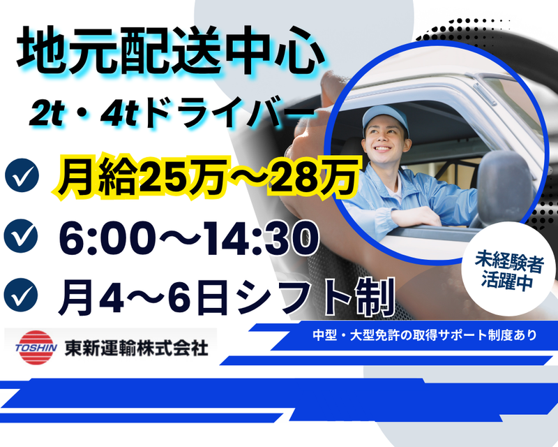仕事の内容 このお仕事の注目ポイント! 1.未経験でも大丈夫!2t・4tトラックドライバーとして新しいキャリアをスタート 2.高収入が魅力! 月給25万円~28万円、さらに年2回の賞与あり! 3.地元配送中心!長岡市周辺のスーパーへの食品配送 4.安定業界!仕事量が減らない食品配送 5.資格支援充実! 中型・大型免許の取得サポート制度あり 【仕事内容】 長岡市エリアを中心に、冷凍・冷蔵食品の配送をお任せします。 お届け先は、スーパー、小売店、卸売市場などさまざまです。 ・扱う商品:冷凍食品・冷蔵食品 ・使用車両:2t・4tトラック ・配送範囲:下越エリア、半径30km以内 ・配送件数:1日10~15件程度 ・積み降ろし:手作業・カゴ台車での作業 ・車両設備:最新安全機能満載!ドライブレコーダー、デジタルタコグラフ、パワーゲート、エアサスペンション、衝突被害軽減ブレーキ付き 【入社後のサポート】 研修が充実! 入社後は、経験豊富な先輩との同行研修で、1週間~10日ほどの指導期間があります。 その後、独り立ちしての運行がスタートしますので、初めてでも安心です! 車両は選べます! 2t・4tトラックの組み合わせ運行、または固定ルートもご希望に合わせて調整可能です。自分に合ったスタイルで働けます。 休みはしっかり! 基本的に日曜休みの月4~6日のシフト制。休みの調整も柔軟に対応しますので、プライベートの時間も大切にできます! 【この仕事の魅力】 食品輸送業界は、社会情勢に左右されにくいのが大きな魅力。安定した仕事が続いています! 忙しい時期は? 繁忙期(クリスマス、GW、お盆など)は特に配送量が増えますが、残業は少なくプライベートとのバランスが取りやすい仕事です。 【こんな方にピッタリ!】 未経験者でも正社員として安心して長く働ける職場です。 「安定した業界でキャリアを築きたい」「トラックに乗ってみたい」そんな方におすすめ! 職場見学も可能なので、まずは雰囲気を知りたい方はぜひお気軽にお問い合わせください。 お待ちしています! 【こんな経験が活かせます】 ・地域密着型の配送業務 ・2t・4tトラック、軽貨物、バスやタクシーの運転手 ・配送ドライバー経験 ・トレーラー、タンクローリーなどの運転経験者もOK!