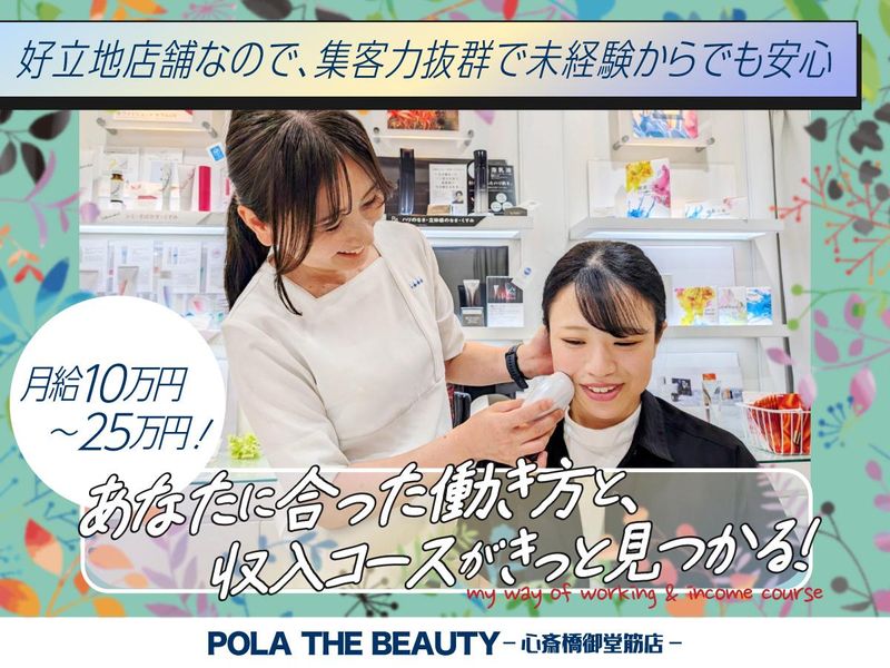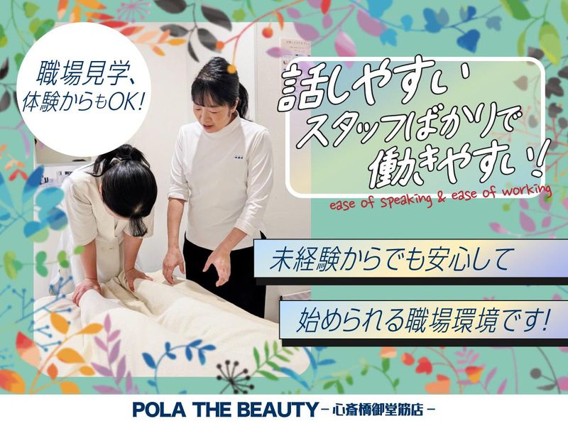 仕事内容 POLA独自のカウンセリングやフェイシャルエステなど。 「エステ」というと難しいイメージもあるかもしれませんが、肌診断やメイクレッスンなど、覚えやすい内容から一つ一つ始めていきます。 充実した研修や、スタッフ同士で見せ合いをしながら模擬形式で進めたり等、 楽しく覚えていく事ができますので、未経験からでも安心♪ 【好立地店舗だからこそのメリット♪】 心斎橋駅からスグの店舗なので、たくさんのお客様がご来店くださります。 集客に恵まれた好立地店舗なので、未経験から始める方にとっても、順調に自分のお客様が増えていくところは当店ならではの魅力です♪ 安定した収入と、自分の希望する働き方を実現しやすい環境です。 【研修は、現在の仕事を続けながらWワークでもOK!】 ★最初の1~2ヵ月は研修期間となります。研修は在宅でも店舗でもOK!期間中はWワークOK! 現在のお仕事を続けながら、空き時間で勉強、仕事帰りに研修も可能です。 ★3ヵ月目にデビュー!初めは友人や家族をお店に呼んで実践でエステを行います。 その後は、あなたのペースで成長していってください。もちろんデビュー後のフォロー、サポートも万全です! 【職場見学やお仕事体験を定期的に行っています】 「オンラインでの企業説明」「メイク体験」「技術体験」「ハンドエステ体験」…など、 まずは職場見学やお仕事体験をしてみたいという方も大歓迎です♪ 【様々な働き方にも柔軟に対応いたします】 オーナーは経験15年の子育てママで、子育て、行事、予定、急な体調の変化、生理、産休・育休など、女性ならではの働き方や子育ての両立にとても理解があります。 あなたらしく輝けるよう、ご希望の働き方を全力でご支援いたします。 「Wワーク」「予定や子育てと両立したい」「キャリアアップしていきたい」 など、理想の働き方やイメージはそれぞれの方々にあると思っています。 【子育て中のママさんも多数活躍中♪】 ライフステージに左右されない働き方が可能です! 未経験、無資格はハンデになりません! 年齢も20~50代・ミドル世代など幅広く活躍できる環境です! 前職も「看護師」「販売」「飲食」など様々な先輩がたくさん活躍していますので、皆スタート時の気持ちは分かります。 Wワークなど、様々な働き方にも柔軟に対応します。まずはお気軽にご相談ください♪ 【POLAだからこそ安心できる】 ★大手化粧品メーカーPOLAのエステやアイテムなので、品質も保証されています。 ★最新の美容の勉強やテスター品、サンプルなどのお試しもあるので、働きながらキレイになれます♪ ★志望動機は何でもOK!「エステに興味がある」「POLAの商品が好き」「やってみたい」など、様々な理由で始めた先輩もたくさんいますので安心してくださいね! ★日本エステティック協会の資格取得支援もあり!また、実績によりボーナスがあり、社員旅行など楽しいこともたくさんご用意しています♪