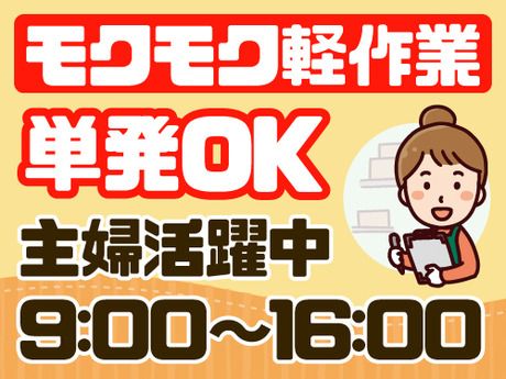 仕事内容 かいろ・季節限定のお菓子・防寒具など、 冬に売れる日用品を仕分けします。 商品が流れてくるラインにあわせて棚へ分け、 数を数えて梱包するだけのシンプル作業。 モクモク作業好きな方にピッタリ! 【お仕事詳細】 ・商品の仕分け ・梱包作業 ・ラベル確認や数量チェックなどの軽作業 ◎こんな方におすすめ ・モノをきちんと分けるのが得意な方 ・ コツコツ作業が好きな方 ・体を動かす仕事が好きな方 扱う商品は小物が中心で、体への負担も少なめ。 シンプルな軽作業だから、コツコツ進めるのが得意な方にぴったり! 黙々と集中して作業したい方にも人気の現場です。 また、親子・兄弟・ご夫婦で働いているスタッフも多く、 「家族と一緒に働きたい」「都合の合う日に働きたい」という希望も大歓迎♪ <このお仕事の魅力ポイント!> ◎単発OK! ◎平日のみ・土日のみもOK ◎食堂・ポット・電子レンジ・ロッカー・自販機完備 ◎服装自由&自転車・バイク・車通勤OK 「いい雰囲気の現場で、マイペースに働きたい」そんな方にぴったりの環境です! 小さな商品が中心だから体にやさしい◎ 食堂と休憩室も完備しています。 <Q&A>入社までの流れについて Q. 応募してからどれくらいで働けますか? A. 応募から入社までは、1週間~通常2週間以内の現場が多くなっています。 Q. 急いで仕事を始めたいのですが対応してもらえますか? A. 即日面談やスピード対応が可能な案件もご案内可能! ご希望をお伺いして、最短で就業できるお仕事をご紹介いたします。 Q. 他の仕事と比較してから決めたいのですが、相談だけでも可能ですか? A. もちろん可能です。 複数の選択肢をご提示しながらご案内します! <Q&A>収入について 【お給料の支払いについて】 Q. 日払いは対応していますか? A. はい、日払いに対応しています。 前日の11時までに申請⇒当日の夕方までにお給料をお受け取りいただけます。 Q. 夜勤の場合でも日払いは可能ですか? A. はい、夜勤後も対応可能です。 お仕事終了後、朝11時までに申請⇒その日のうちにお給料をお受け取りいただけます。 Q. 前払い制度はありますか? A. ご利用可能です。 詳細は勤務先や就業形態によって異なりますので、ご相談時にご希望をお伝えください。 Q. 申請方法は難しいですか? A.どなたでもスムーズにご利用いただけます。 スマートフォンやPCからの申請も可能です!